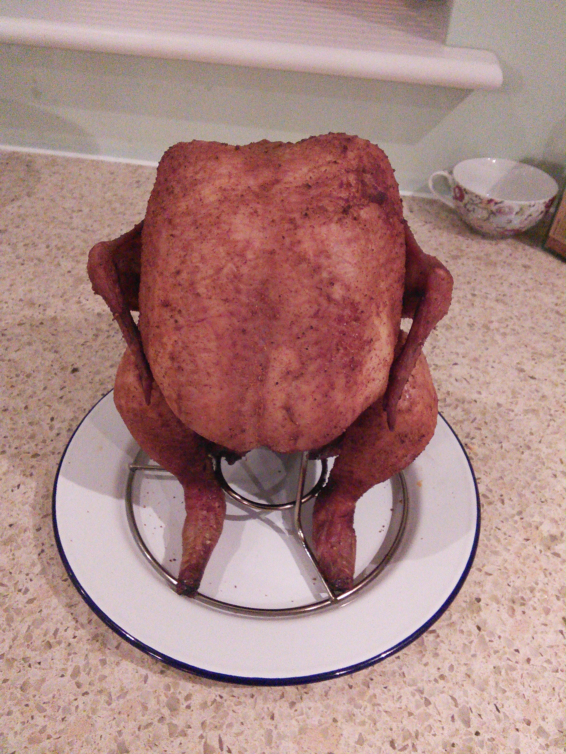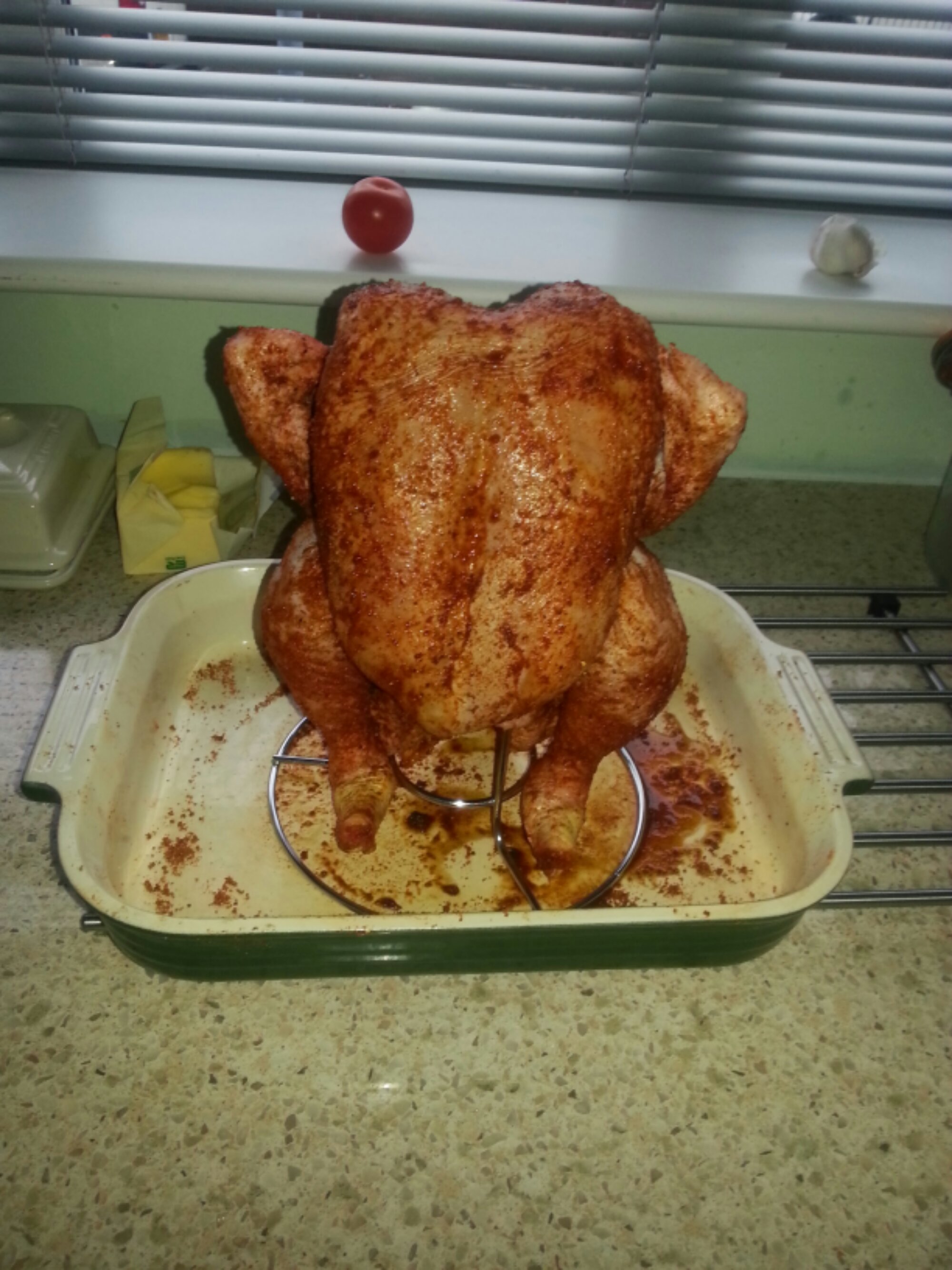 As the name suggests the recipe does usually involve the use of a beer can with this having the dual purpose of enabling the chicken to sit upright (the can goes up the rear end into the cavity) so as to get a more even cook and to keep the chicken nice and moist. From what I have read the contents of the can does not actually add any discernible flavour to the meat so I see no reason why could not use lager (Fosters has to be useful for something I suppose) as a substitute for proper beer (which is for drinking) or even a cola. If using a can, make sure that you open it (please, please, please remember to do this) and pour out an inch or so of the liquid (if sensible by drinking it, unless it’s Fosters in which case down the sink it goes). As my Pro Q Frontier smoker has a water bowl I dispensed with the beer can (hence the title of the post- although I could have used beer in\added it to the water bowl) and used a vertical chicken roaster instead.