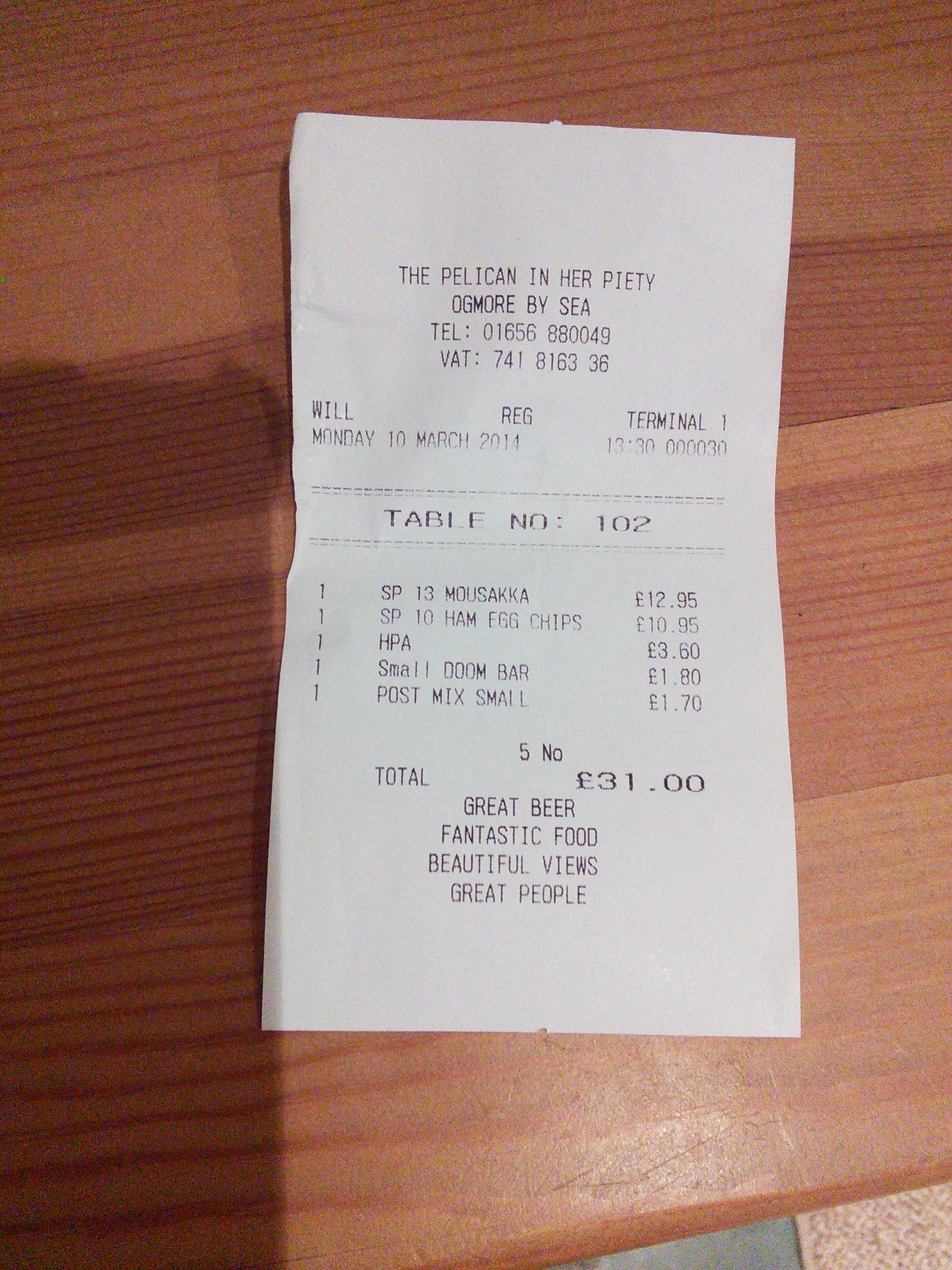The bill (with drinks) came to £31, which I thought was an awful lot for what we got. We could have had the two course lunch at the Potted Pig in Cardiff for that price, which I know would have been much better.