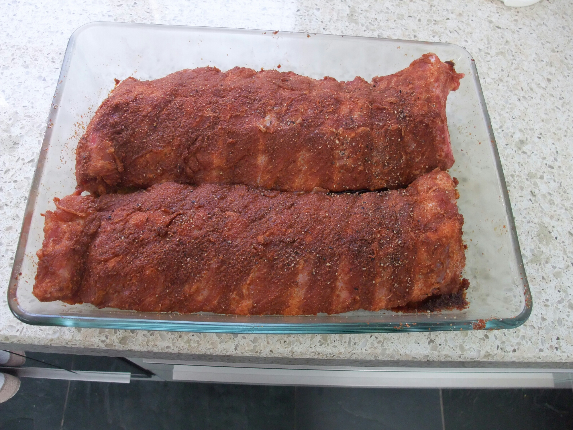 Put the rub covered ribs in the fridge for at least 6 hours and preferably overnight. Either wrap then in clingfilm or put them in a dish and cover it with clingfilm. This helps with the process and help stop the smell (nice as it will be) lingering in the fridge. I know this as I didn’t do this and the fridge still smells of the rub (luckily we have two fridges and I didn’t put it in the main one or else I would really be in the dog house).