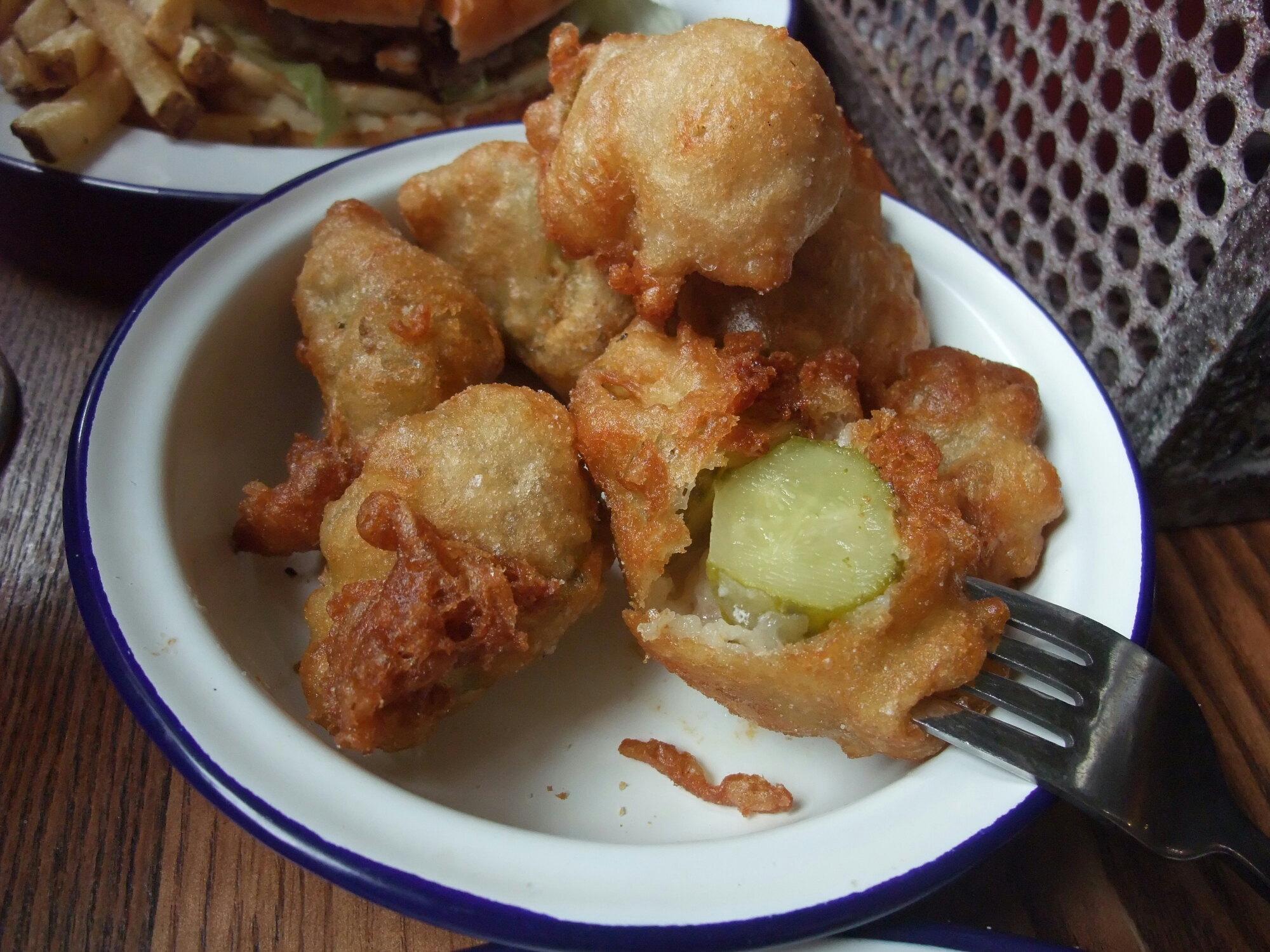 We also ordered a portion of the deep fried pickles to go with the burgers. These were epic. Crisp batter encasing a nice sized cube of juicy salty pickle. Yummy. J had one, pronounced it very nice, and left me to scoff the rest. These bested the Meat Liquor version, with the chunky pickle cubes working better than a long thin slice.
