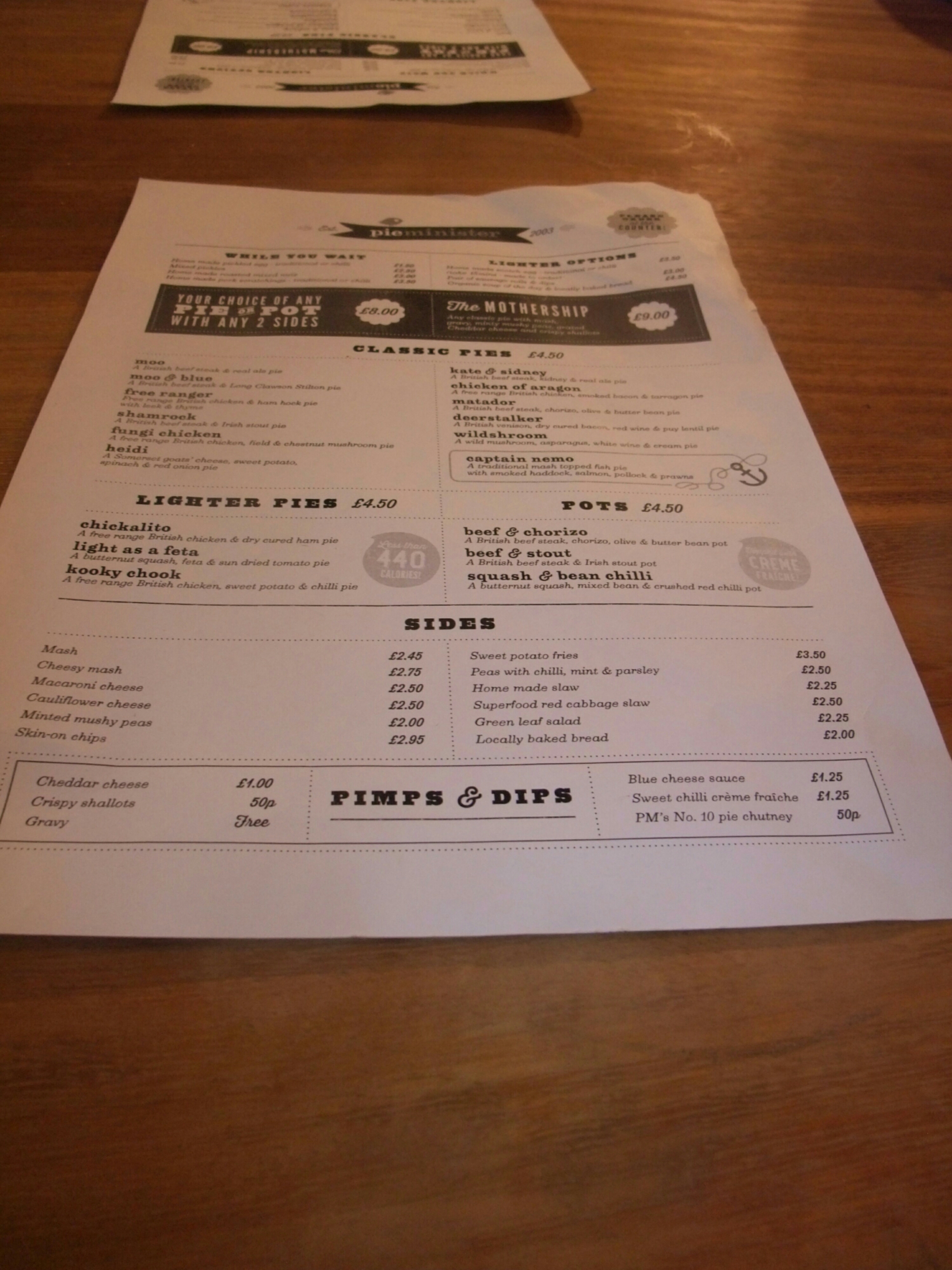 […] menu with details of the pies on offer is fairly short (as against the likes of Pieminister, who seem to have turned to the dark side with their bottomless pie brunch – pie and a […]