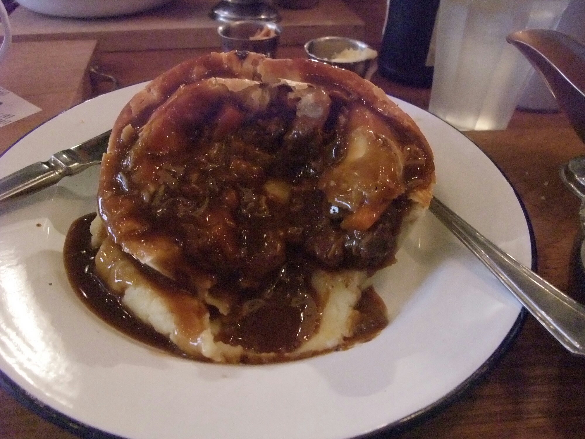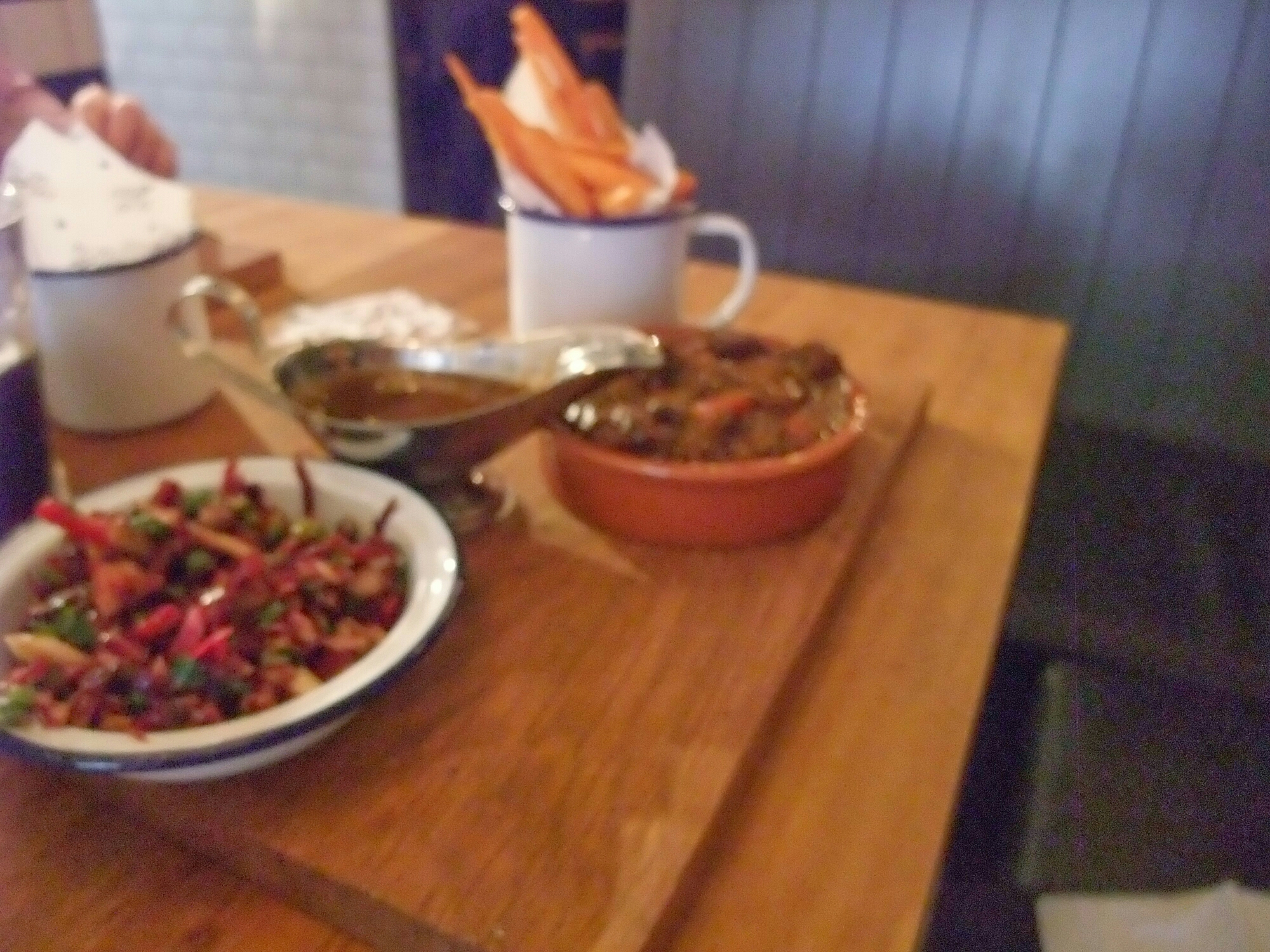 Rach, having to be different and not wanting a pie (despite me pointedly saying “It’s a bloody pie restaurant, they do pies”), went for a beef and stout pot (basically the pie without the pastry – I know I don’t get it either) with a red cabbage slaw and sweet potato fries. The slaw had a good balance of flavours and a nice crunch to it which went surprisingly well with the richness of the steak and stout pot. The sweet potato fries were very nice, crisp on the outside and soft on the inside and were well seasoned (I was told off for nicking too many). The pot came with gravy which was a bit odd as there was nowhere to pour it bar from in the pot dish which neither needed it nor could in reality accommodate it. I suppose you could dip chips in it, presuming no one in their right mind would add it to the slaw but to me it seemed a bit pointless unless you went for mash as a side.