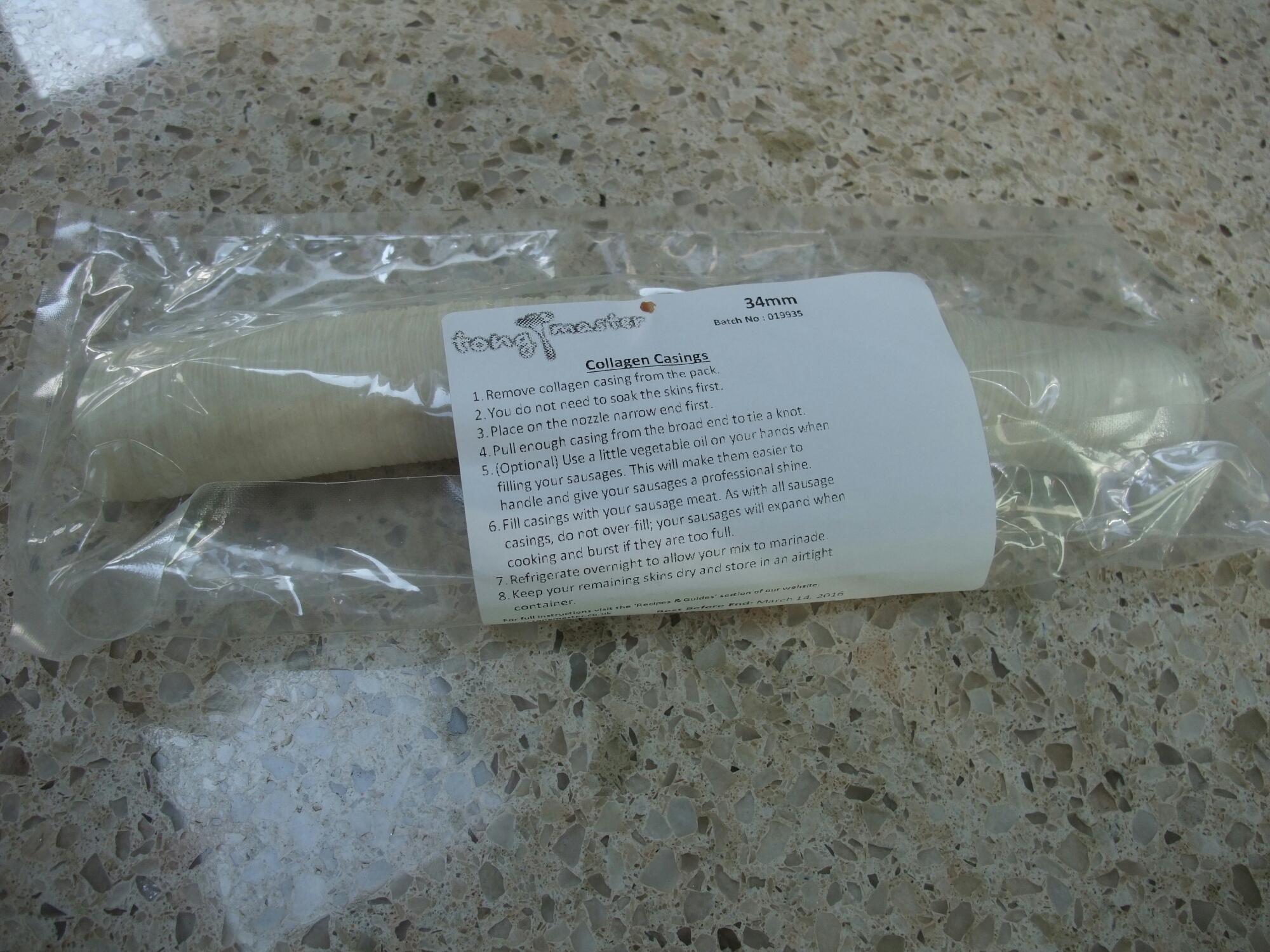 I use collagen casings for my sausages as I find they are easier to handle than natural casings (that need to be soaked). I get them from Tongmaster and for this I used a 34 millimetre casing size. I know it’s probably not the done thing to use the collagen casings for hot links, but they are OK to eat and I find them much easier to handle than natural casings.