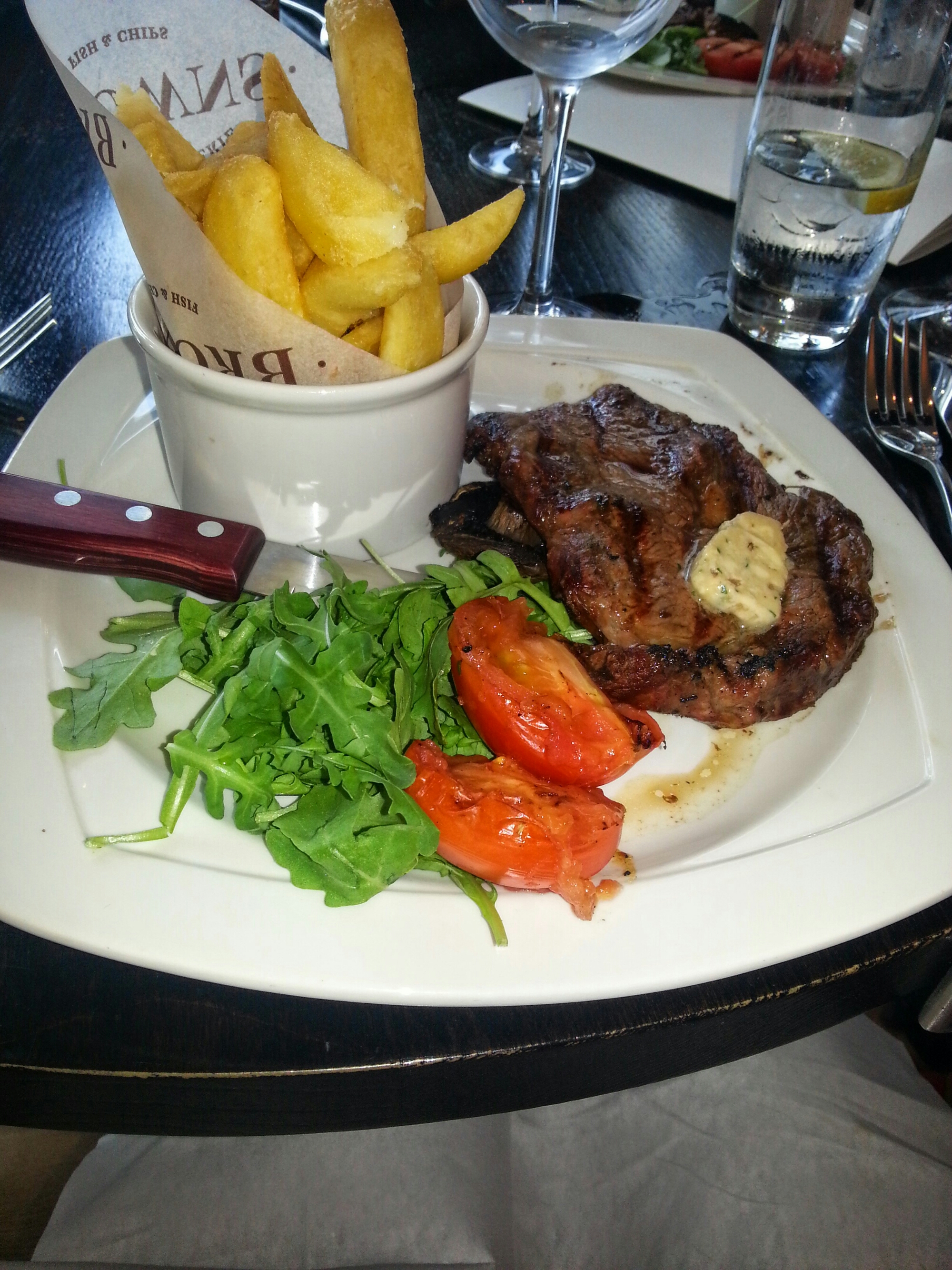 Next up was my main, which was advertised as 28 day aged west country rib eye steak served with anchovy butter, watercress, roasted plum tomatoes, baked flat mushrooms (note the plural) and chunky chips.