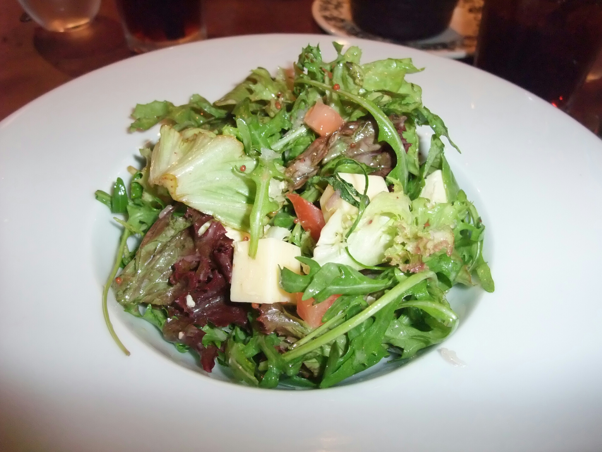 Rant over and on to the food which, whilst not perfect, was not at all bad when you take into account the price. I started off with the 3 cheese mixed leaf salad. On asking the waitress what the 3 cheeses were I was told perl las (a welsh blue cheese, which is a favourite of mine), cheddar and ” umm , something from Carmarthen I think “. Cheese salad always reminds me of when I briefly went vegetarian in my youth to (I hoped) impress a girl (it didn’t remotely), I was rather taken with, who was a vegetarian. In those bygone days cheese (usually only cheddar) salad was the only, deeply unimaginative, vegetarian option on most restaurant menus.