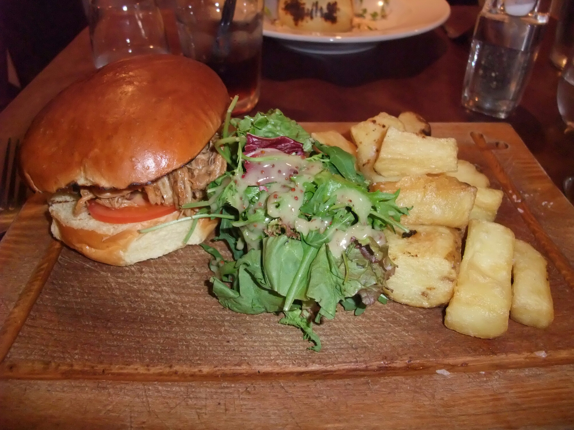 My pulled pork with chunky chip was pleasant enough, with the pork having a nice smoky flavour to it coupled with a vinegary (in a good way) barbecue sauce. The chunky chips were indeed chunky, as well as being for the most part crisp on the outside and fluffy on the inside (as any good chip should be). They were well seasoned with a nice amount of sea salt on them. My only gripes with this dish were a rather dry bap and it being served on a wooden board. What’s wrong with a nice plate? By all means display stuff on boards, slates or whatever takes your fancy, but I like my food served on a proper plate thank you.