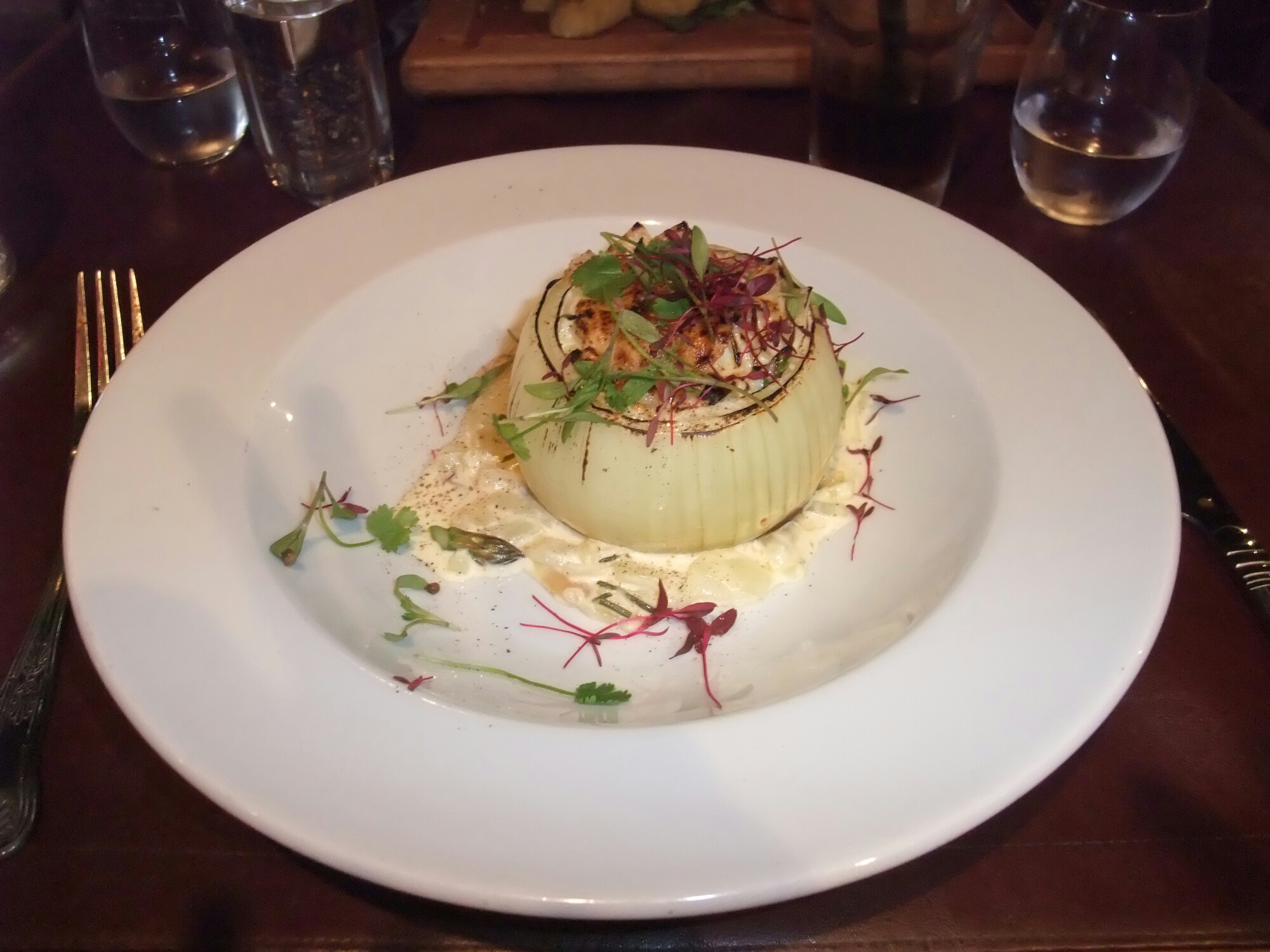 J eventually choose the vegetarian option (still being on her frankly odd caveman diet) on the menu, which was billed as a baked stuffed onion, with cream, parmesan and asparagus. This was perfectly nice if a touch the samey (the onion seemed to be primarily stuffed with onion so really it was just a baked onion or is a baked potato actually a baked stuffed potato) and a bit lacking in asparagus (3 small pieces only). It was also quite rich with the cream and parmesan. To me it needed a touch of acidity (a squeeze of lemon) to cut thought the richness of the cream and cheese sauce.