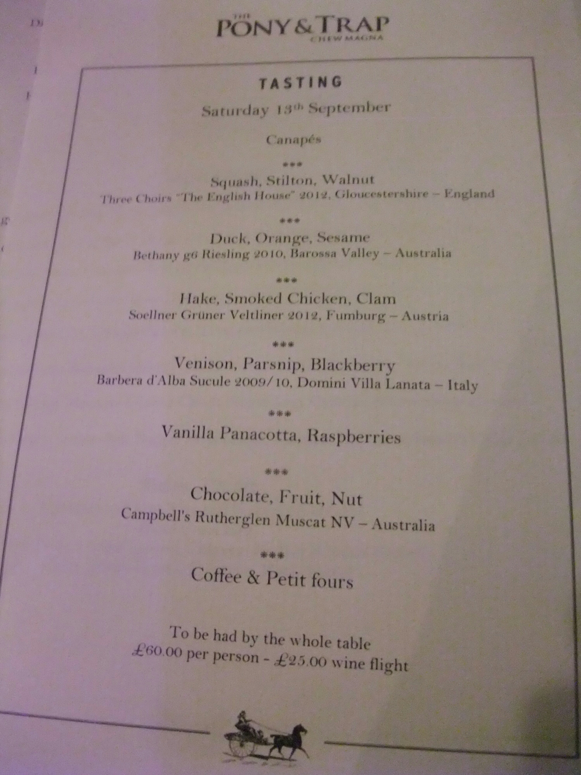 We were shown to our table in what I would regard as the snug and provided with both the al a carte and tasting menus. Both were chock-a-block with stuff that got the juices going, but whilst tempted by the Home Front Ration Pack (one of Josh Eggleton’s dishes on last series of the Great British Menu) and the Grouse (which I love) on the al a carte menu Mrs. SF and I were always going to go for the tasting menu (£60 a head + £25 for the flight of wine with it).