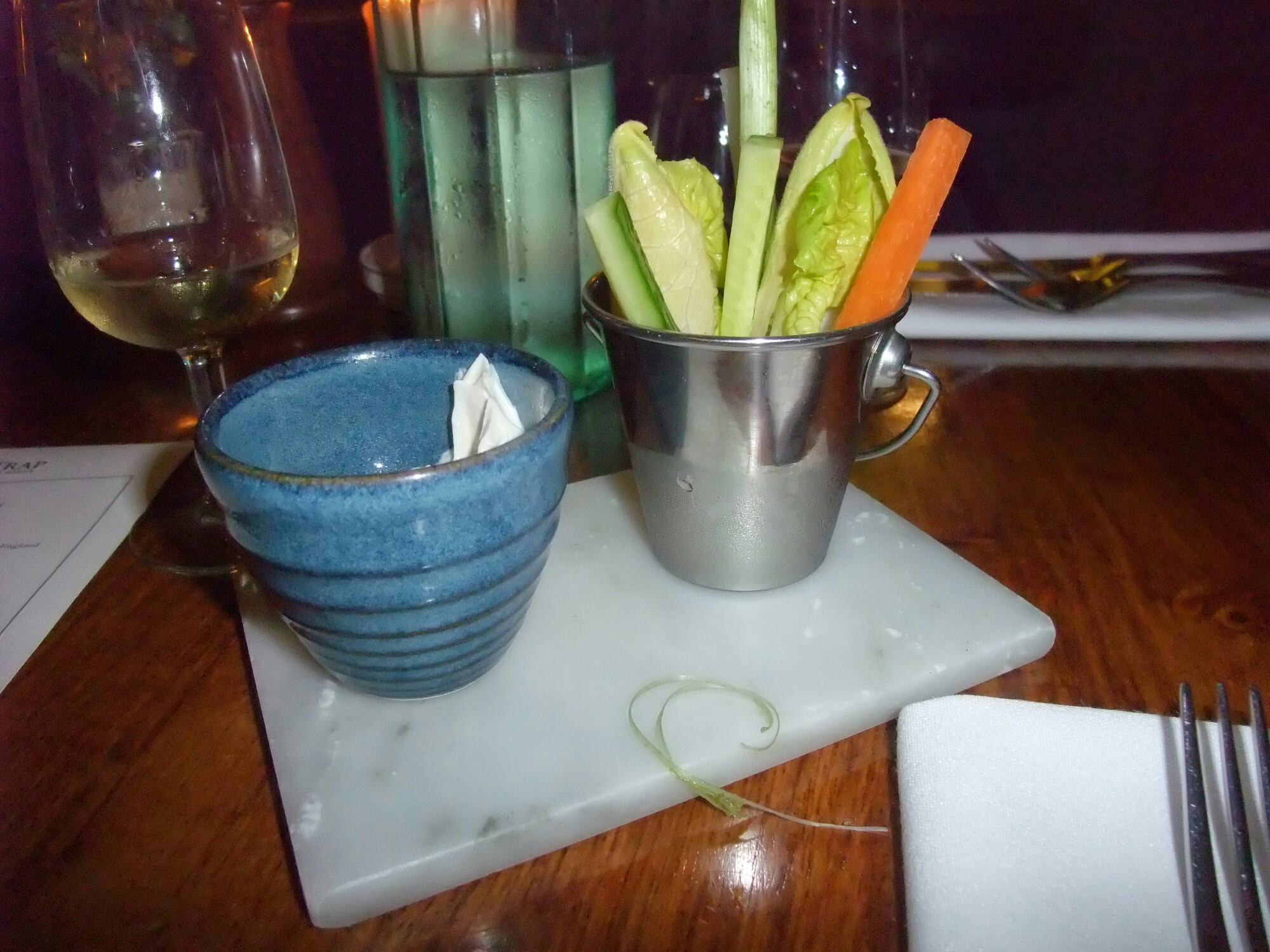 The first of the two sets of canapes were some locally grown crisp raw vegetables (carrot, spring onions, cucumber and lettuce leaves) that were as fresh as a daisy (they could well have been picked that day) and tasted of what they were in spades (veg. these days rarely does). They came with a pot of nicely flavoured and subtly smoked fish roe dip. This was about as far away from the radioactive pink taramasalata you usually see as you can get. The flavours in the dip complemented rather than overpowered the veg. A simple, but delicious dish where the raw ingredients did all the talking.