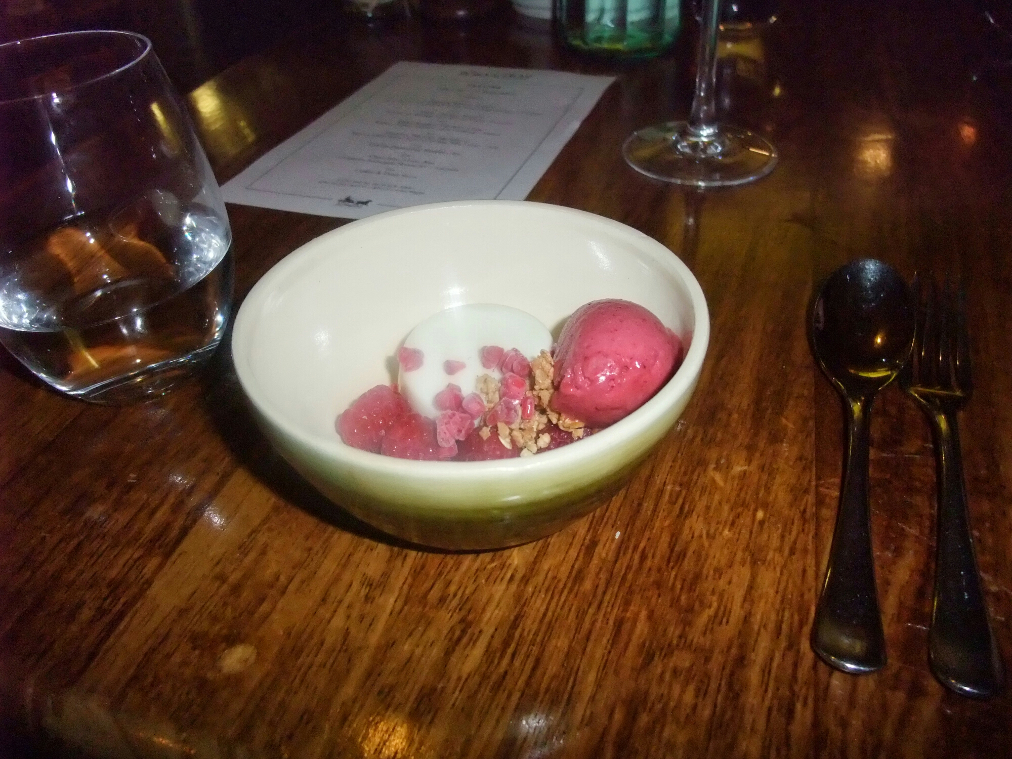 This dish included both fresh and freeze dried raspberries and a rasberry sorbet. The raspberries were grown down the road from the pub in a village called Pensford. They were probably the best raspberries I have ever tasted and were absolutely bursting with flavour. These, together with a perfectly executed vanilla panacotta (just the right wobble and the vanilla flavour not overdone), made for a great desert, with the intense raspberry sorbet acting as a nice palate cleanser. A sort of granola added some welcome texture to the affair