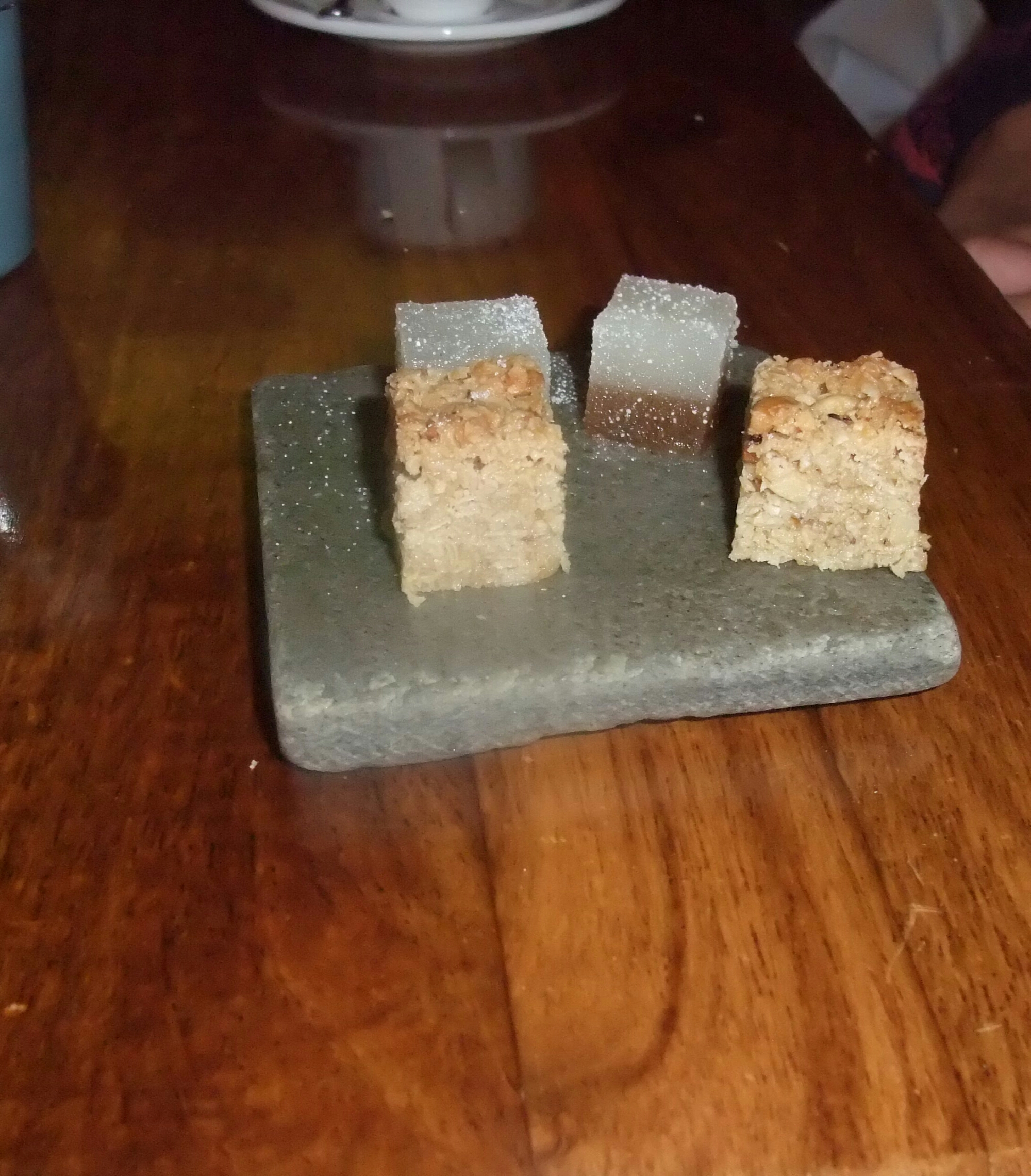 We finished off the meal with coffees (me a filter -a tad weak for my tastes – and Mrs. SF an espresso – just right) and some excellent petit fours in the form of peanut butter flapjacks (good) and some beautifully zingy jelly cola cubes (blooming lovely). Nice to see coffee was included, as when Mrs.SF and I had the nice but very pricey tasting menu at Asador Etxebarri in Pais Vasco, Northern Spain last year we were more than somewhat aggrieved to find when the bill arrived (with a thud) that coffee was extra.