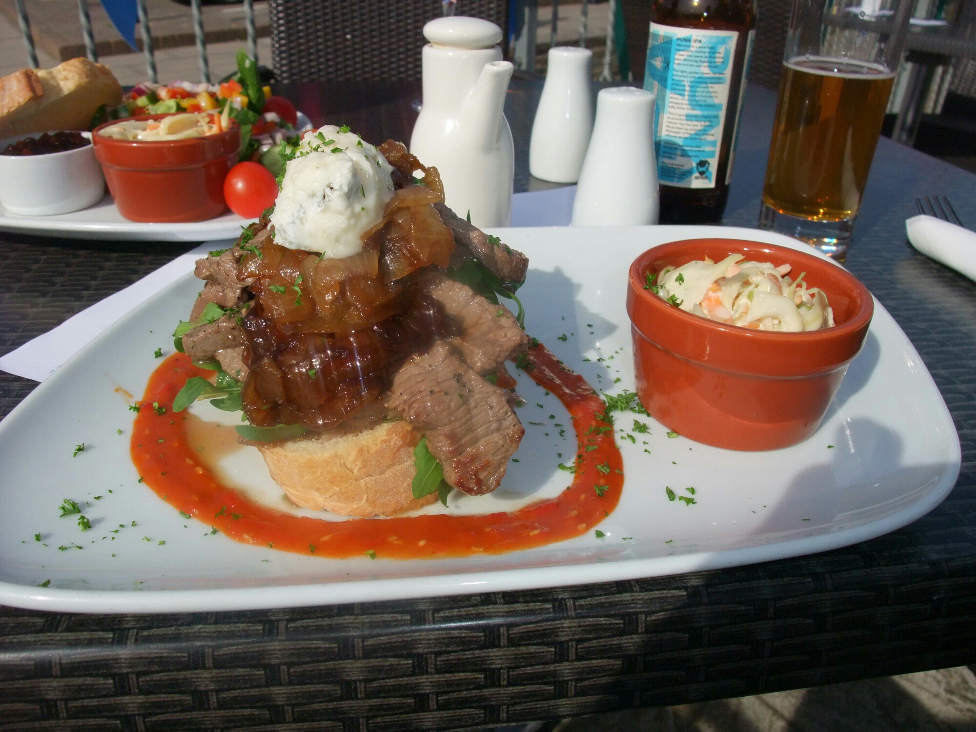 My open steak sandwich was a good sized beast and consisted of a slice of proper white bread topped with rocket, nicely caramelised onions and thick strips of good quality tender steak (rump) cooked medium rare as requested. Add to this a nice salty, sharp blob of dolcelatte cheese on the top and you had a happy me. It also came with a nice enough, if slightly pedestrian, coleslaw. Whilst not fancy it was a nice dish the really hit the spot.