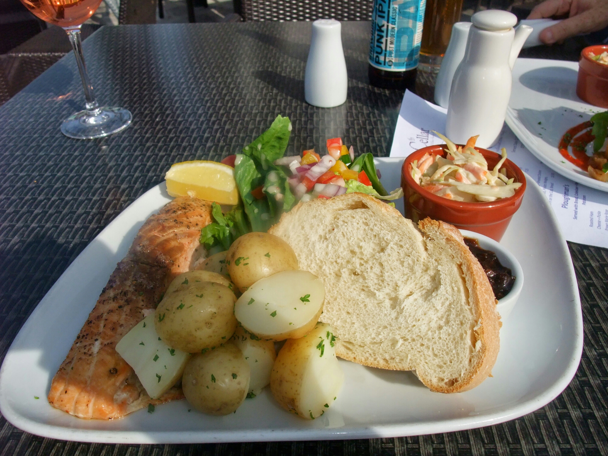 Mrs. SF’s dish of a oven roasted ploughmans was as odd as it sounded. A decent piece of nicely cooked salmon (farmed no doubt. – well it was part of ploughmans :)) was paired with a side salad (lacking anything more than a dribble of dressing), a doorstop slice of bread, new potatoes, coleslaw and most bizzarely a pot of branston pickle. Branston with hard cheese – yes, ham – yes, salmon – definitely no. Somethings go together and salmon and branston pickle ain’t one of them.