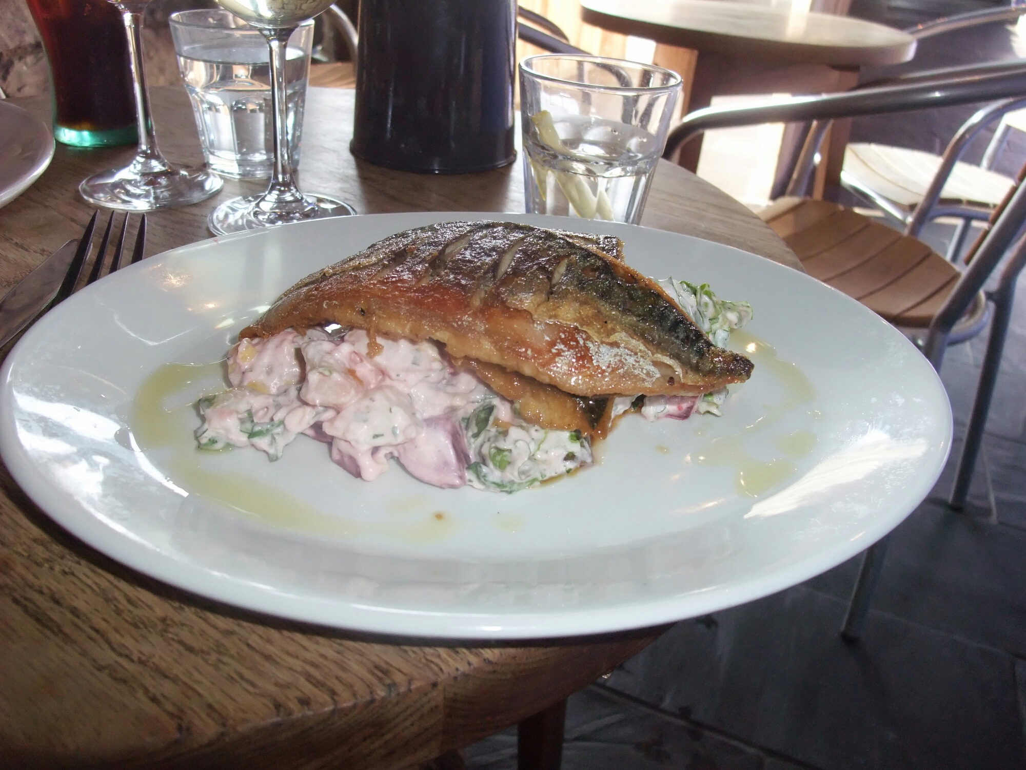 They have a large and varied bar menu which is full of nice sounding stuff ( http://www.harbour-master.com/hotel-wales/food-drink/), but on the day in question both Mrs SF and I were drawn to one of the specials on the blackboard by the bar. This was a lovely grilled piece of mackerel (£11), atop a beetroot and potato salad spiked with a good amount of horseradish (that nature accompaniment to oily mackerel). The fish was perfectly cooked with a nice crisp skin and moist flesh. My only complaint was I had couple of rather large bones in mine – no biggie for me, but the sort of thing that puts some people off. The beetroot, horseradish and potato salad added a nice bite to the dish and with a nicely chilled glass of muscadet (250ml – £6.60) made for a very pleasant lunch. Possibly a touch pricey at £11 bearing in mind mackerel is as cheap as chips.
