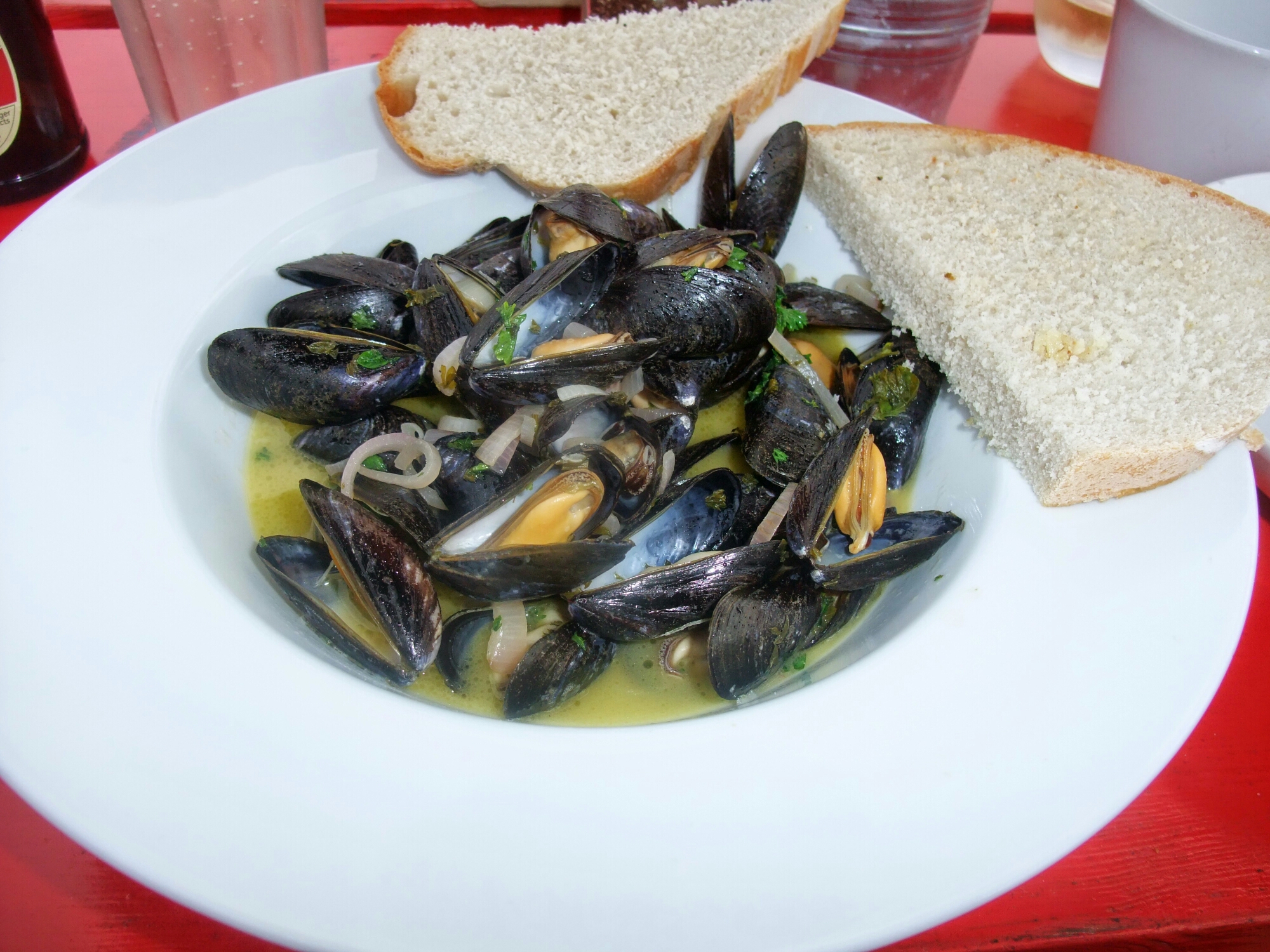 I went for the small bowl of moules – £7.00 (which came with bread rather than fries) and Mrs. SF, a barbequed Chicken and cheese sandwich (£6.00). The later was offered toasted, but Mrs. S.F went for it untoasted (personally I thought melted cheese would have worked better). She pronounced it nice with a decent amount of tasty filling, a good accompanying pot of coleslaw and nice crispy, salty French fries.