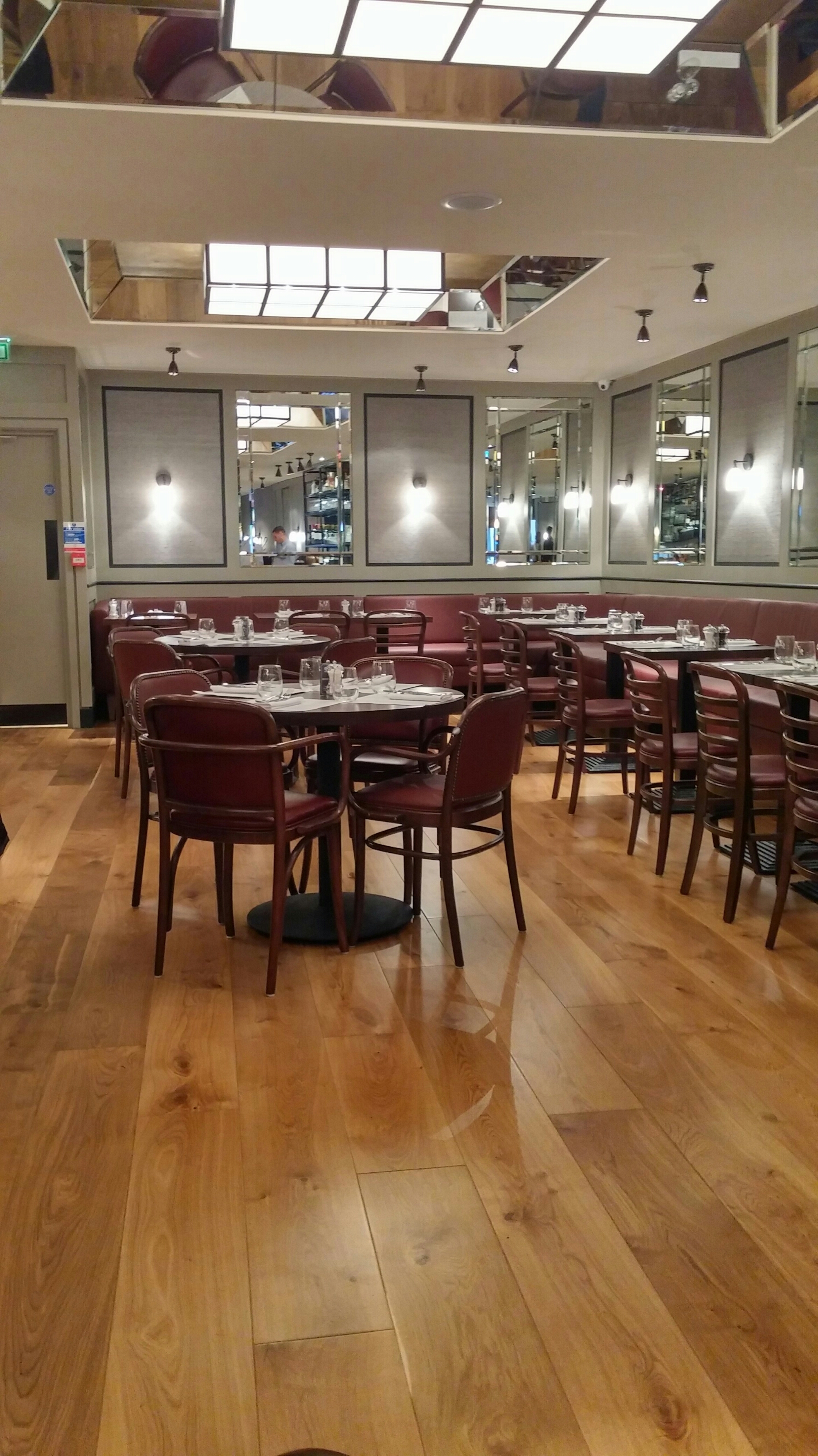 Inside the decor is sort of art deco/noir, with bevelled mirrors, boxed in lights, leather banquettes etc. It does, however, have a somewhat disconcerting touch of the airport departure lounge about it.