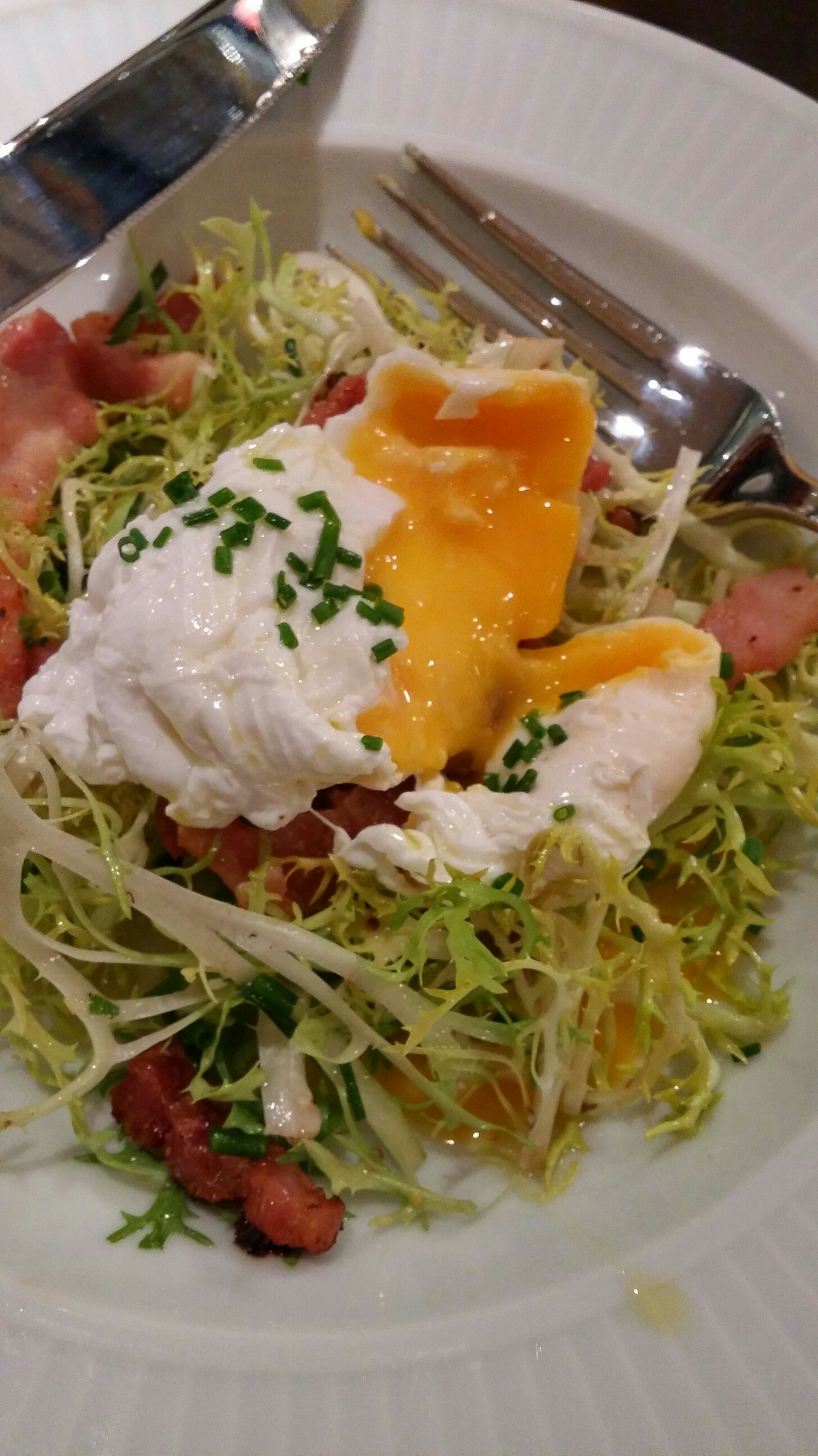 I started off with the salad of frisee leaves and bacon lardons, with a warm poached egg (is there much call for cold ones, I wonder).
