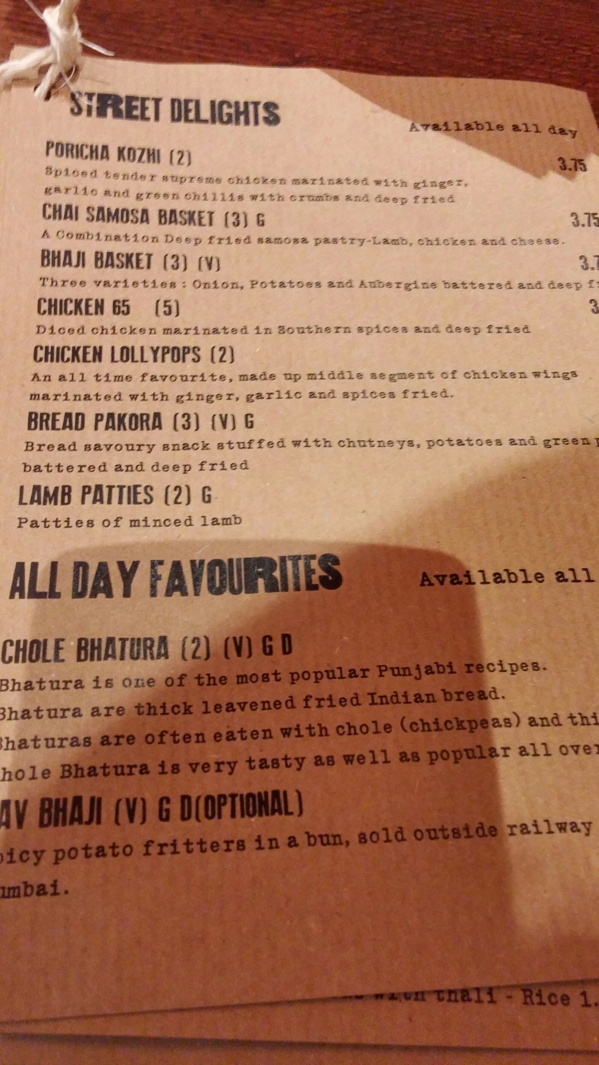 These include marsala coke (not come across that before), nimbu pani (Indian lemonade – with cumin and salt added to the usual mix) and a selection of teas (including chai, with free refills, for £2.25).
