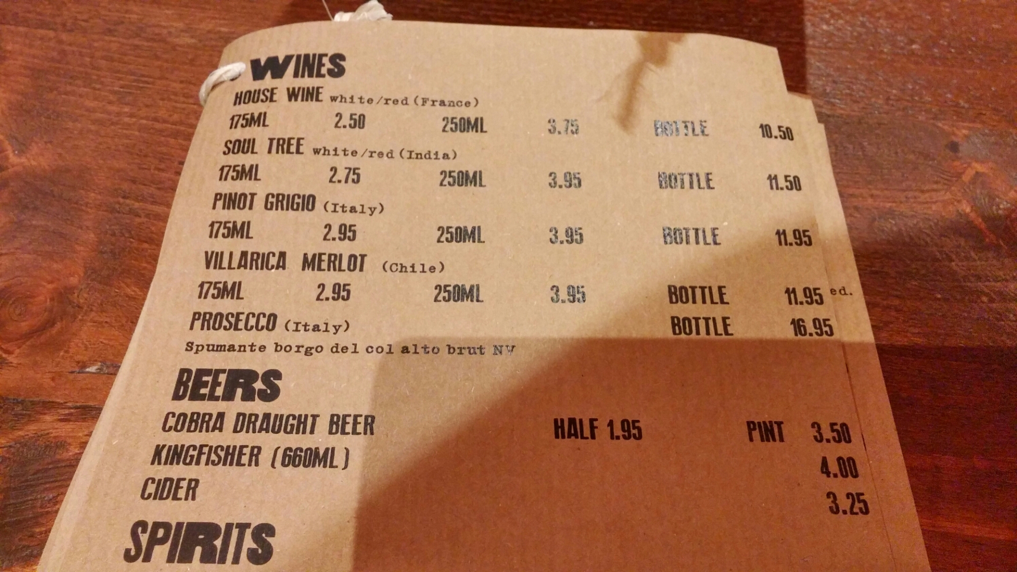 Intriguingly on the wine front (with an otherwise uninspiring but pretty cheap list – would be nice to see a riesling on there rather than a, undoubtedly dull as ditch water, pinot grigio), the list includes an Indian white and red from Soul Tree which were very competitively priced at only £11.50 a bottle.