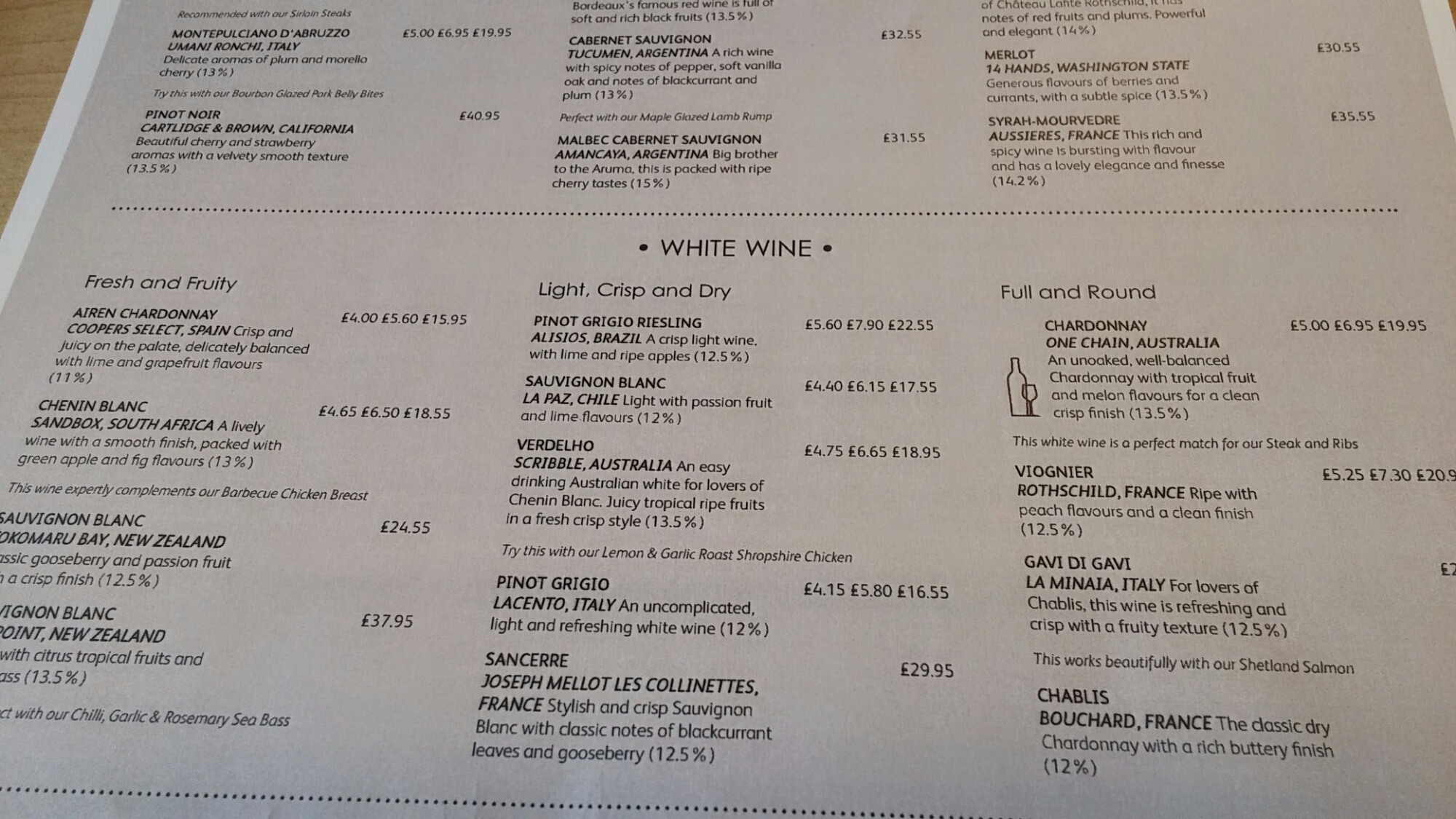 Care is needed in choosing from this list, as some of the mark ups are on the high side (Cartlidge & Brown, Pinot Noir – 300% plus over retail price) whereas other are much more reasonable (Aruma Malbec – only just over 100%). The malbecs/malbec blends on the list (malbec is a good wine for steak) look the best value.