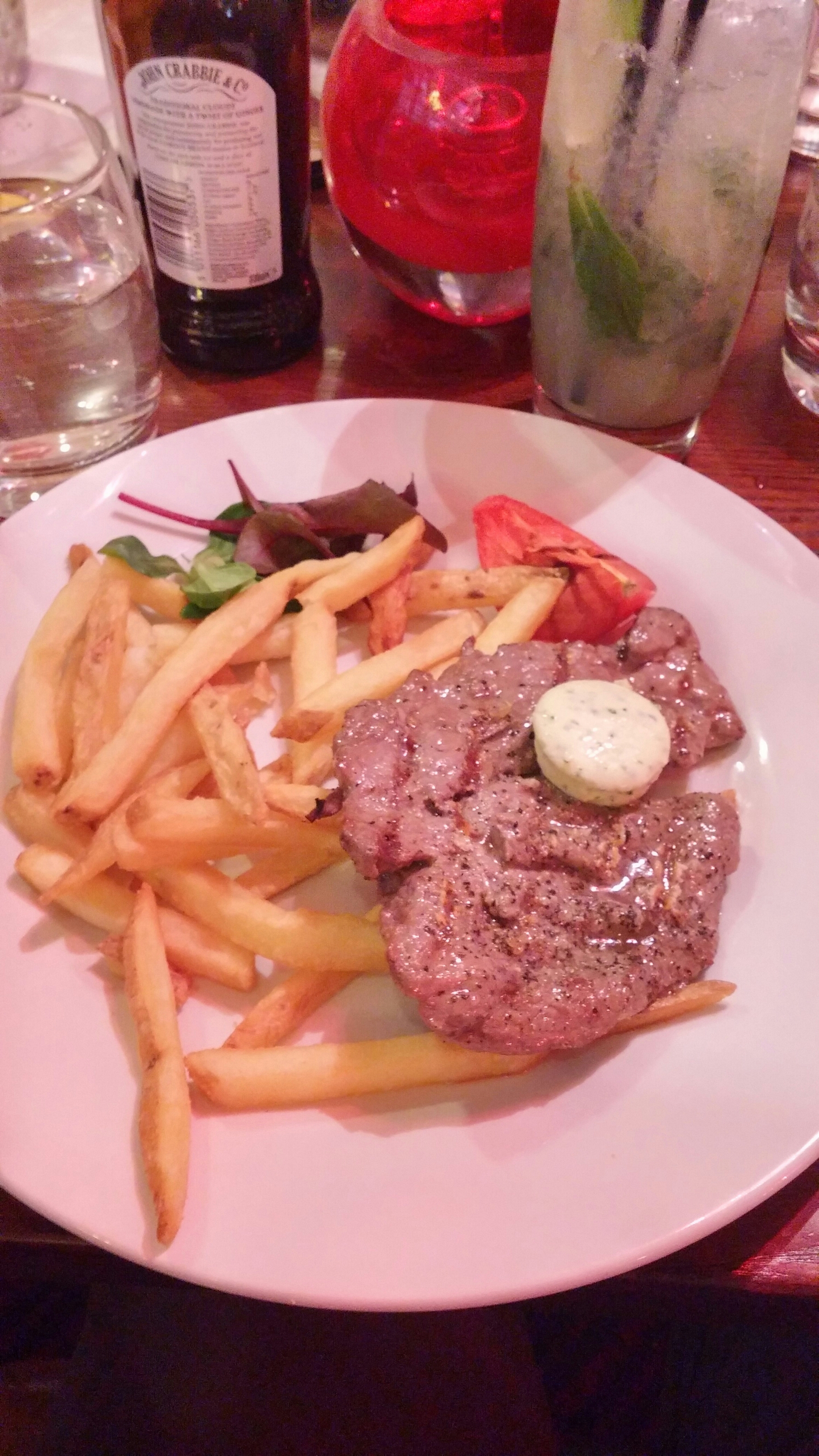 I asked for my minute steak (rump according to the waitress on asking – it looked more like a bavette to me) to be cooked rare and it came cooked a little over for my taste. It also looked a bit insipid – having grill marks, but being strangely pale in colour. It looked, dare I say it, “unloved” and from the colour and grill strips it could quite possibly have been subject to a degree of pre-cooking.