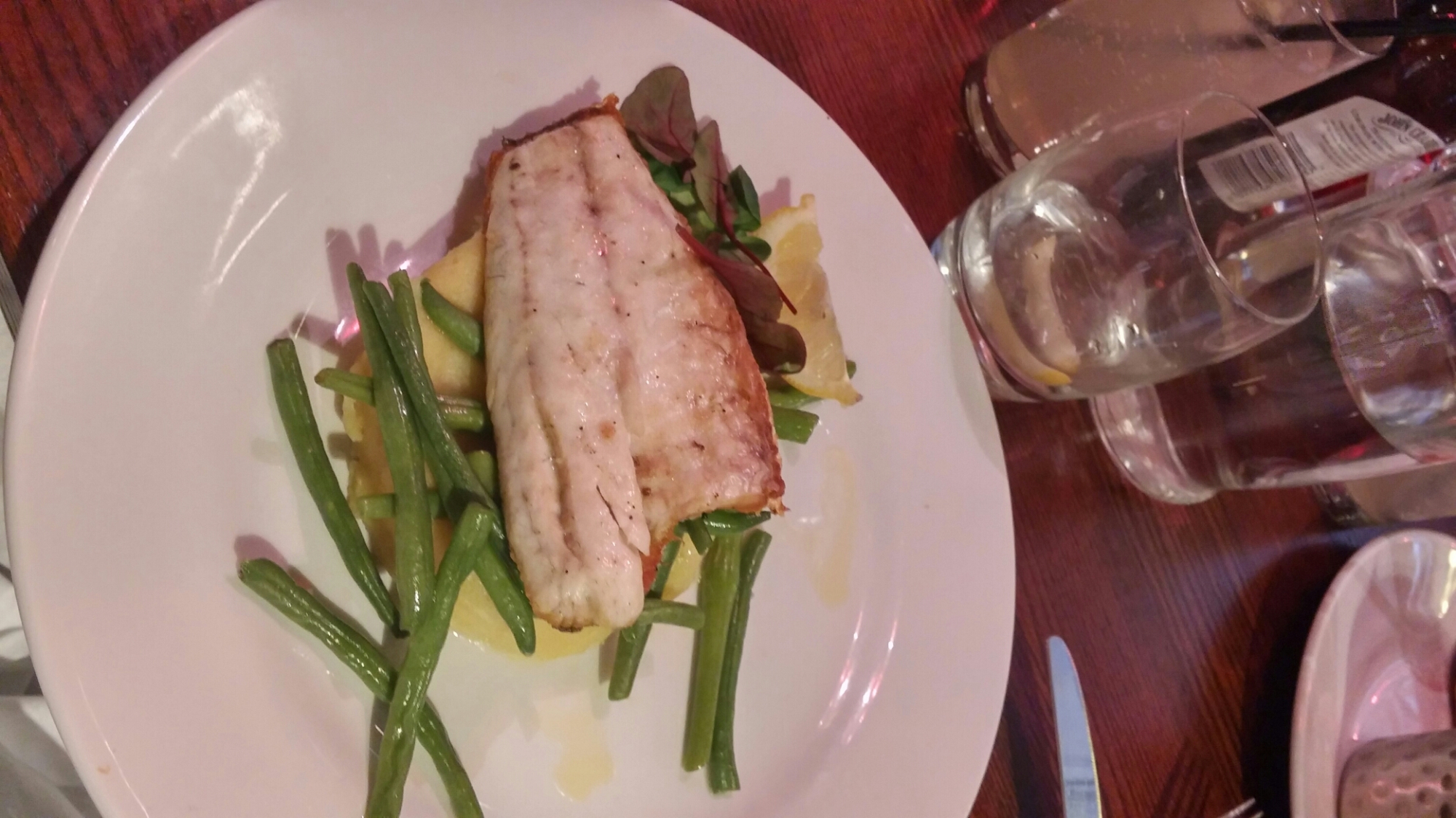 The sea bass was a little on the small size and came with some strangely gloopy mashed potato (and some ok French beans). The bass was, however, said by the person who had it to have a good flavour and a nice crispy skin. All in all a well cooked bit of fish they thought.