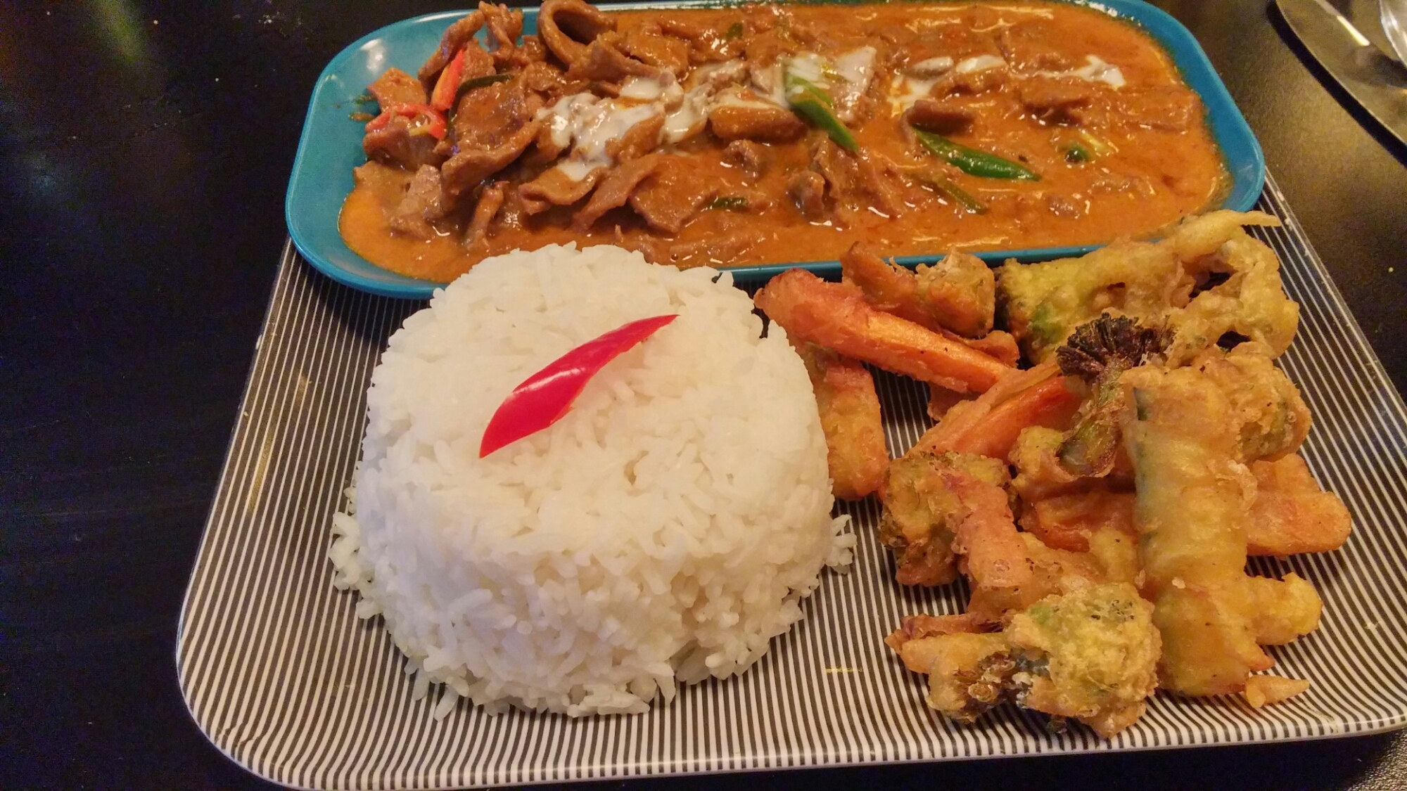 It came with some crisp tempura vegetables (nice, but a bit out of place I thought – would have preferred a refreshing Thai salad personally) and a mound of nicely cooked rice.