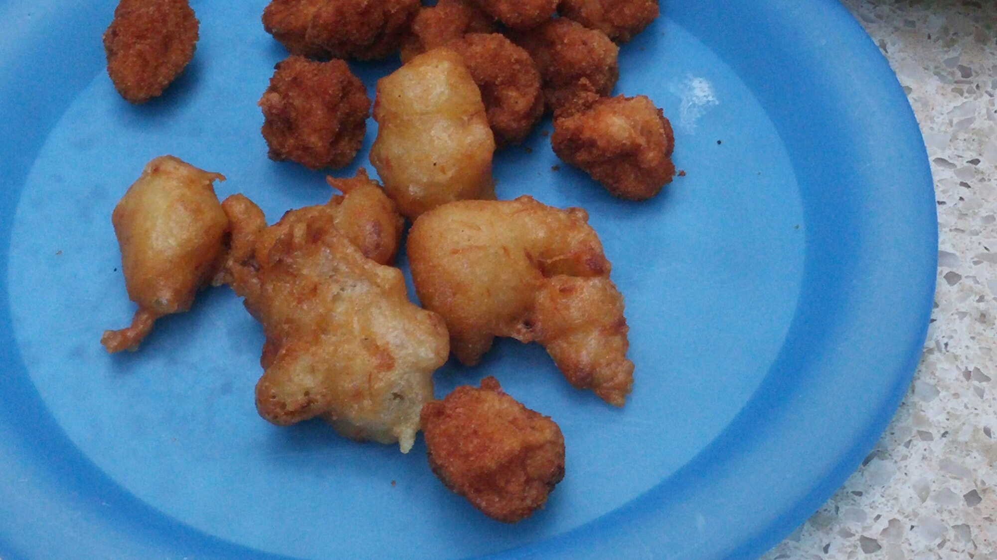 and salt cod fritter (6 for £1.25 ) and popcorn shrimp (15 for £3).