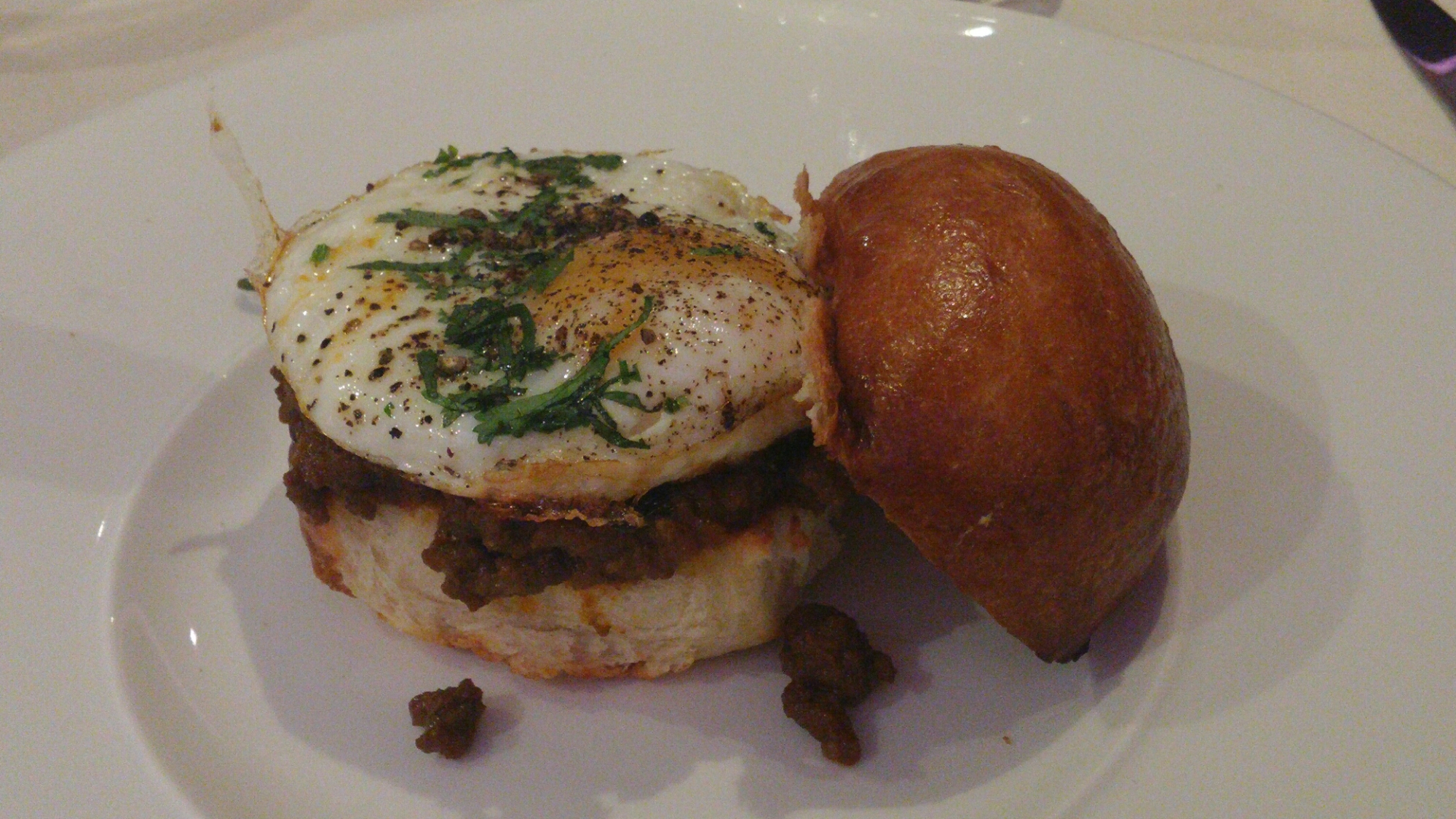 I went for a Venison Pao (£6.95), a sort of spiced “sloppy joe” originating from Lucknow with a fried egg on the minced venison and all of it encased in a soft bread roll (the pao).