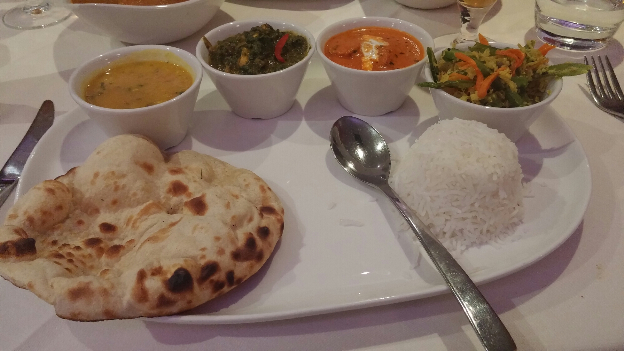 This consisted of a silky paneer mahkni (Indian cottage cheese in a lightly spiced tomato, cream and butter sauce with fenugeek), a nice but not mind blowing yellow dal tadka (yellow lentils, with cumin seeds and plenty of garlic), a saag thumb (a pleasingly hot spinach and sauted mushroom combo with chilli and garlic ) and a thoran (a dry vegetable curry with fresh grated coconut and mustard seed, which added a nice bit of texture). The platter was completed by a crisp on the outside and pillow soft on the inside naan and exemplary steamed rice.