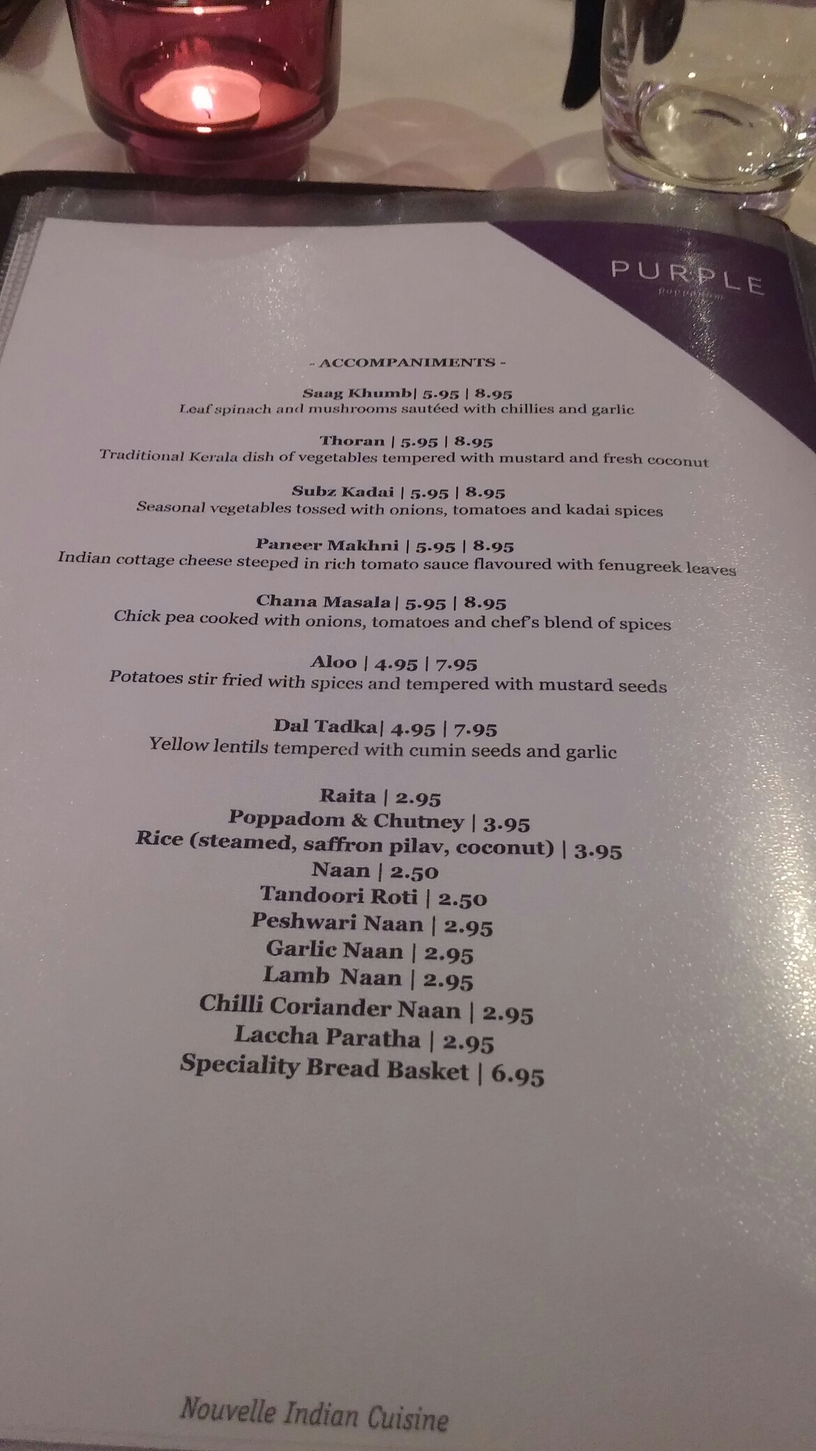 My mother, down for Wales v Uruguay game at the Rugby World Cup (for the price she paid I was half expecting her to be playing), requested we go to a nice Indian after the match and as a dutiful son I duly booked the Purple Poppadum, it being not far from my Llandaff base.