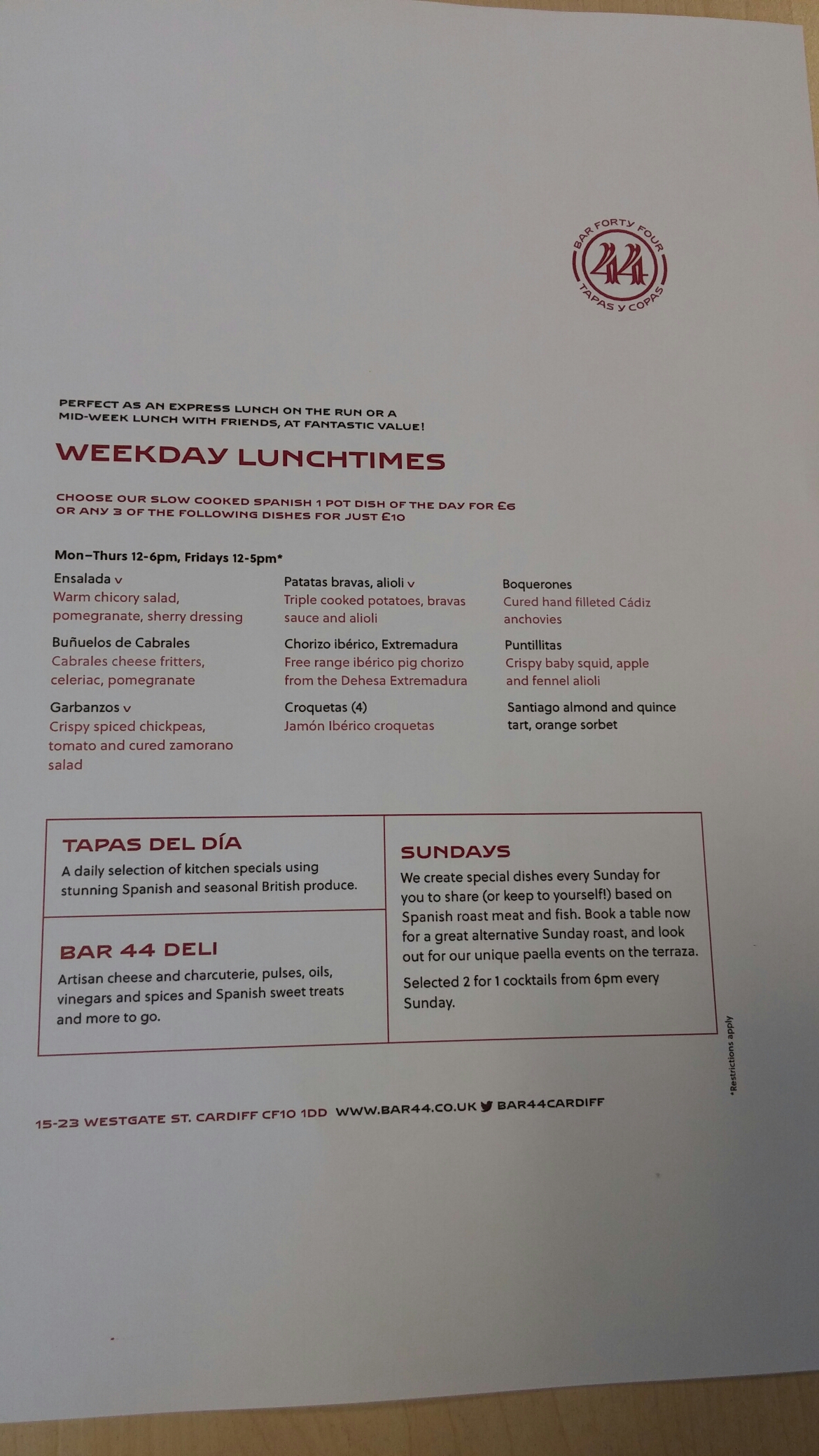 Whilst all of the full menu at Bar 44 is available throughout the day, between 12- 6pm (Mon – Thursday) and 12 – 5pm (on Friday) they have an offer of 3 tapas for £10 (from a limited choice)