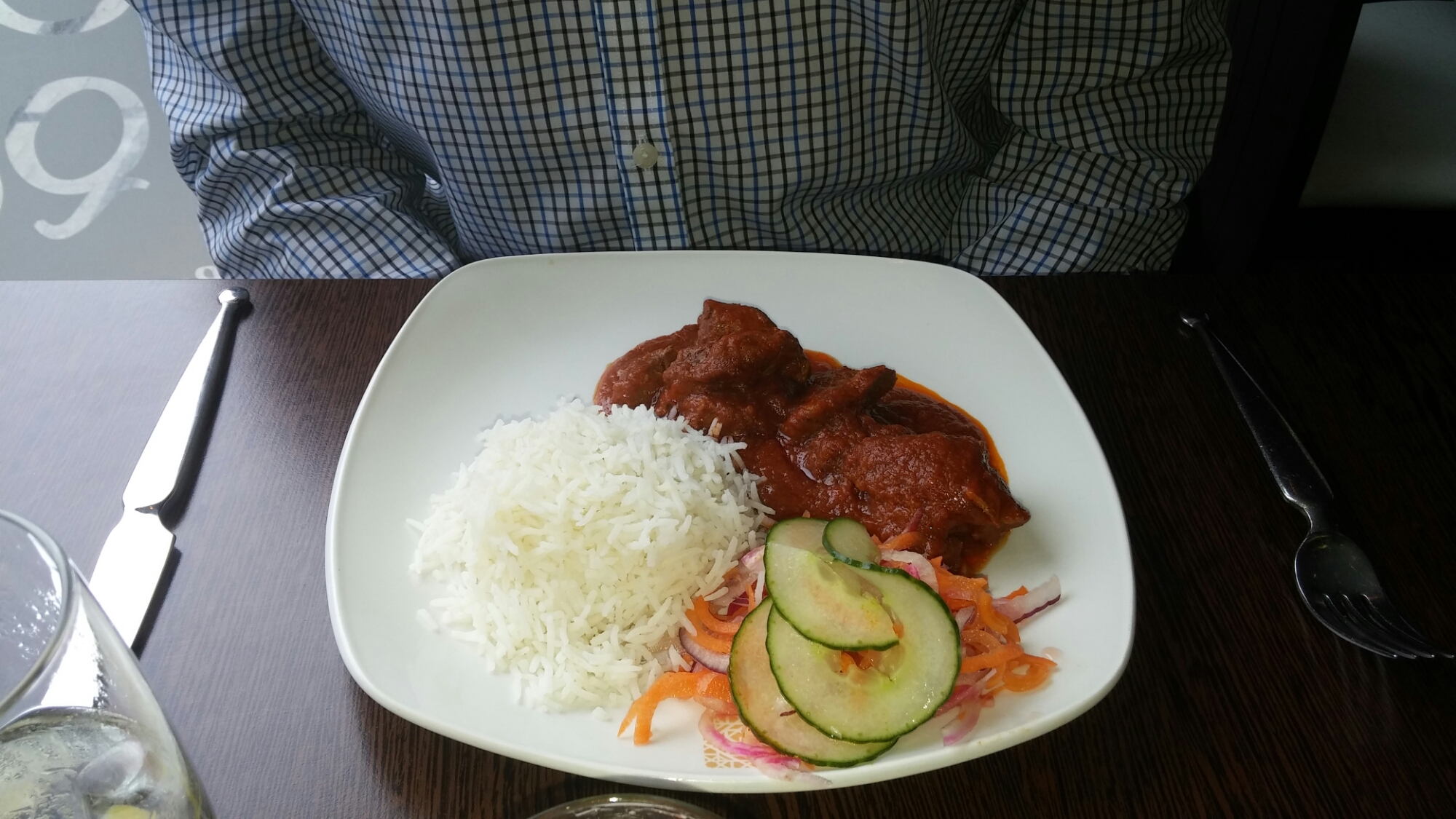 which came with pilau rice and a salad garnish. The lamb was very tender, but the gravy it came in (whilst ok) was lacking somewhat in spice. I got coriander, but not much of the advertised ginger or chilli. The nicely caramelised onions, however, brought a welcome touch of sweetness to the dish.