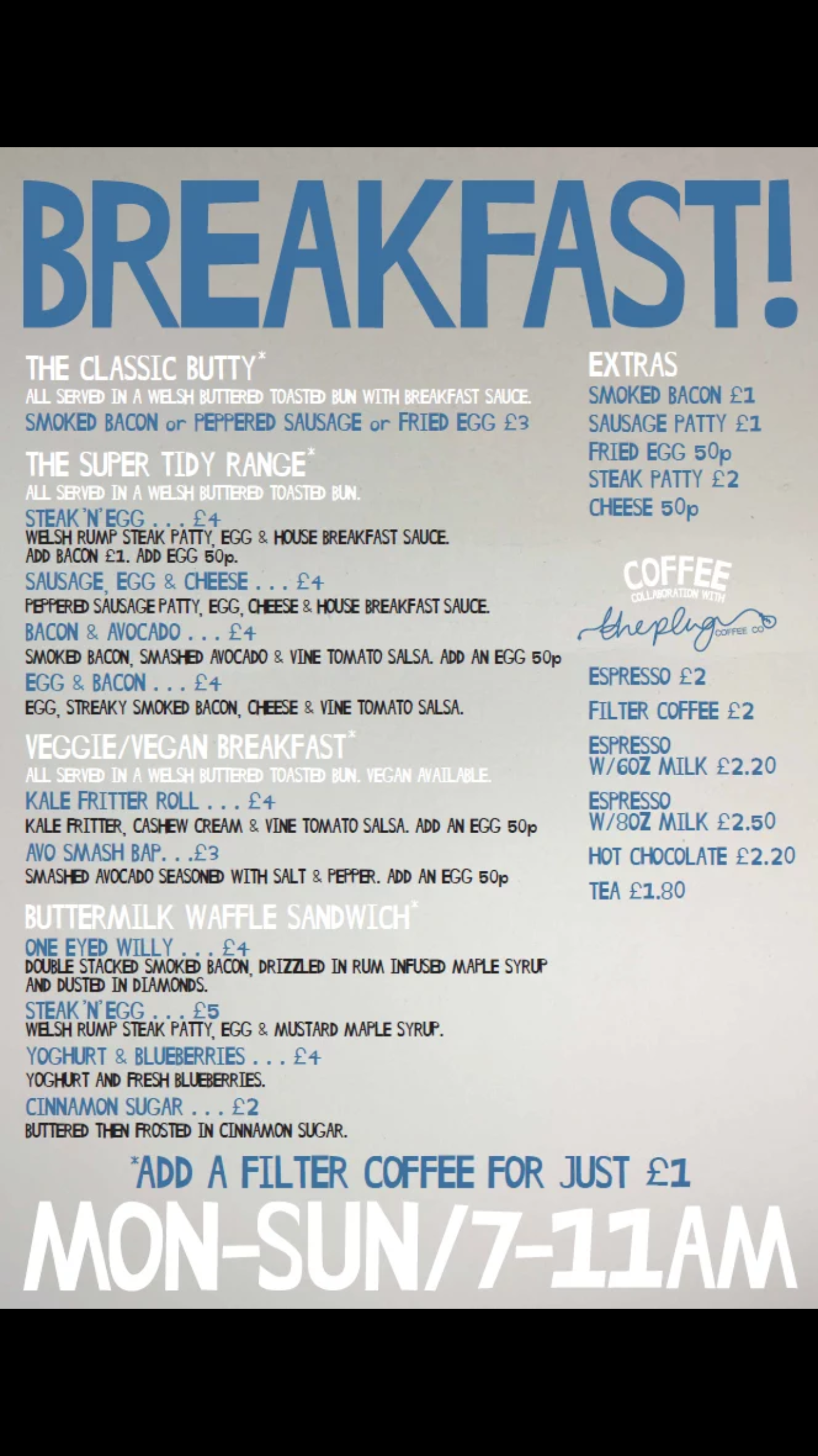 I really was spoilt for choice with the breakfast menu, with butties, buns and waffles, encasing pork or beef, to choose from. Veggies/vegans are also catered for with two options (a kale fritter number and a smashed avocado number) that sound quite nice.