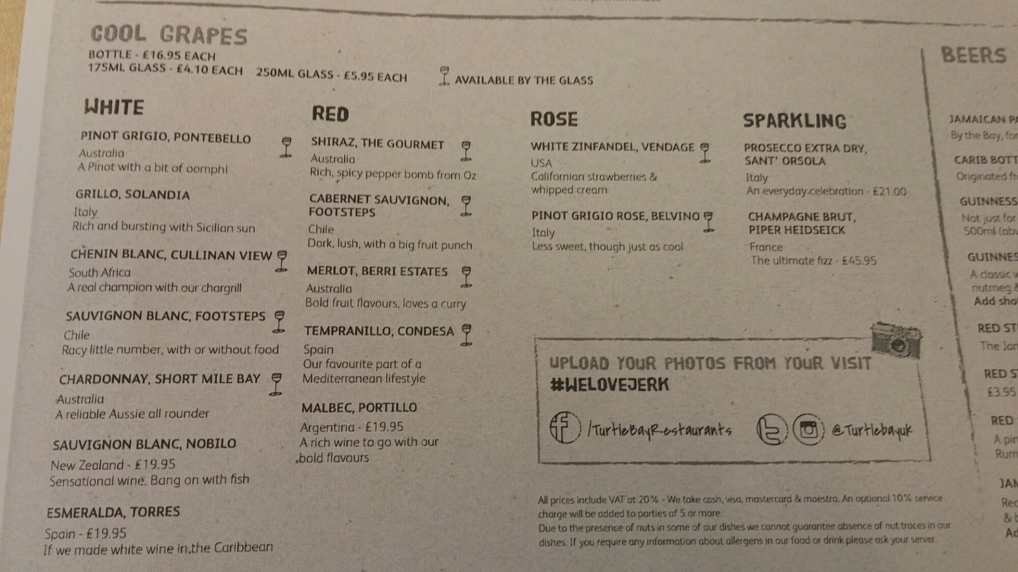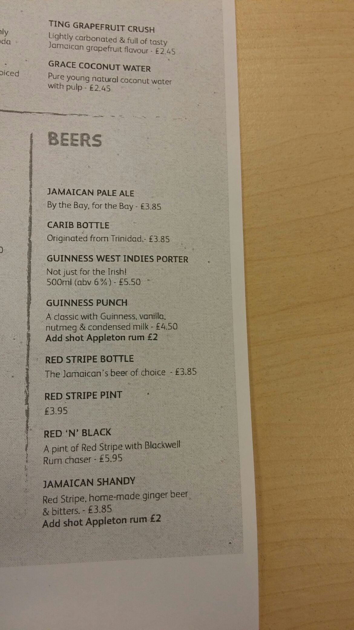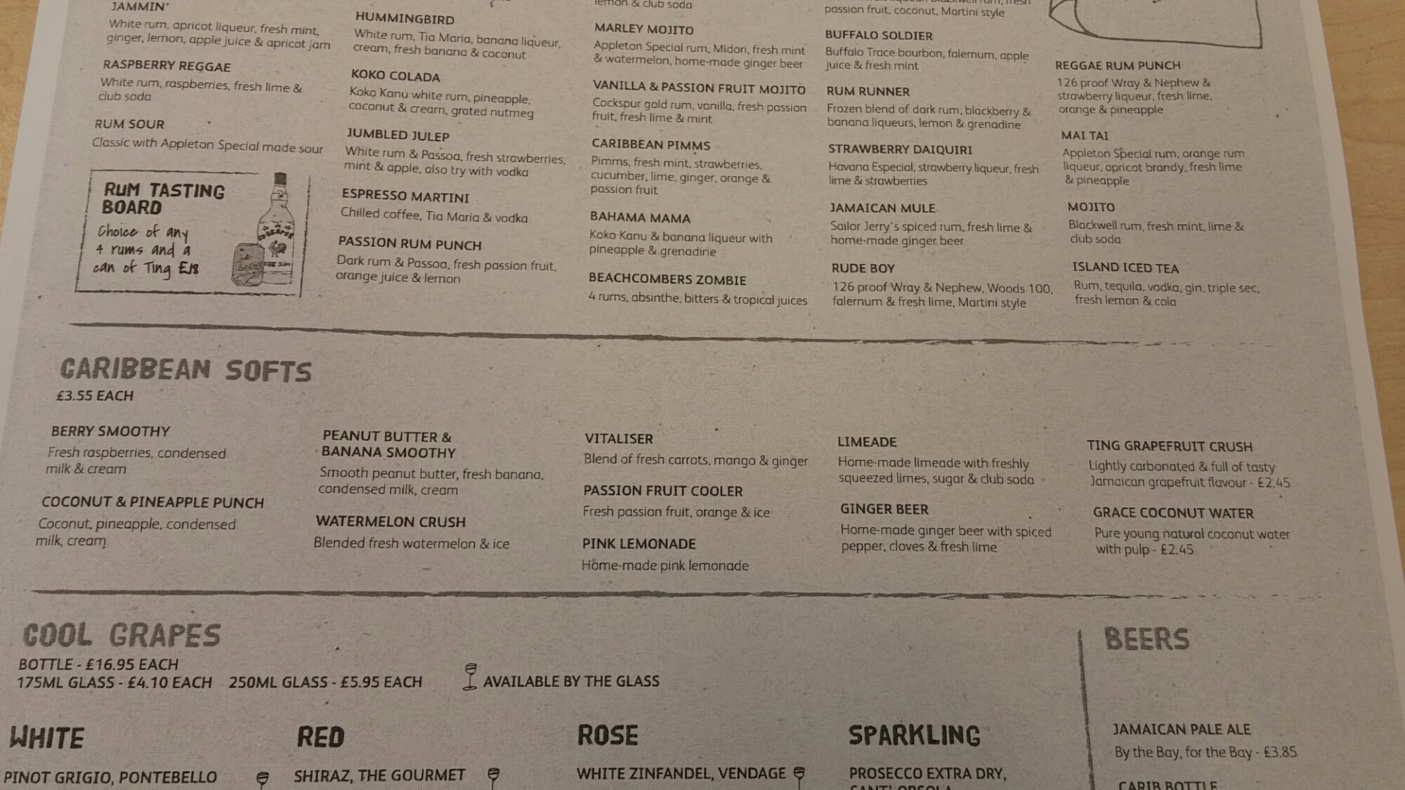 as well as a Caribbean themed selection of beers. I love the sound of the Guinness punch (Guinness, vanilla, nutmeg and condensed milk – £4.50 – to which you can add a shot of Appleton rum for an extra £2)