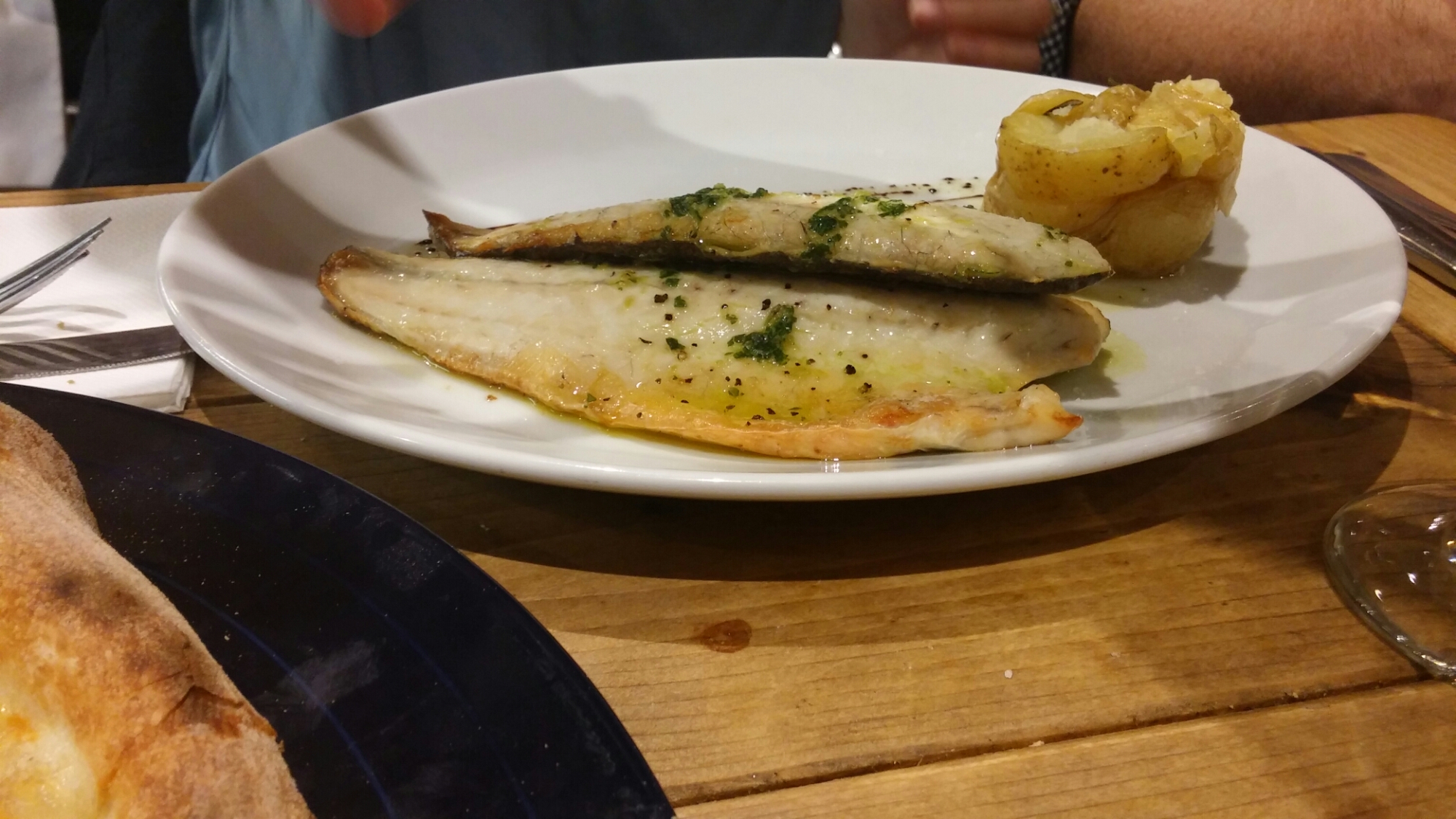 a nicely cooked couple of oven roasted branzini (seabass) fillets (good size portion for £14.95)
