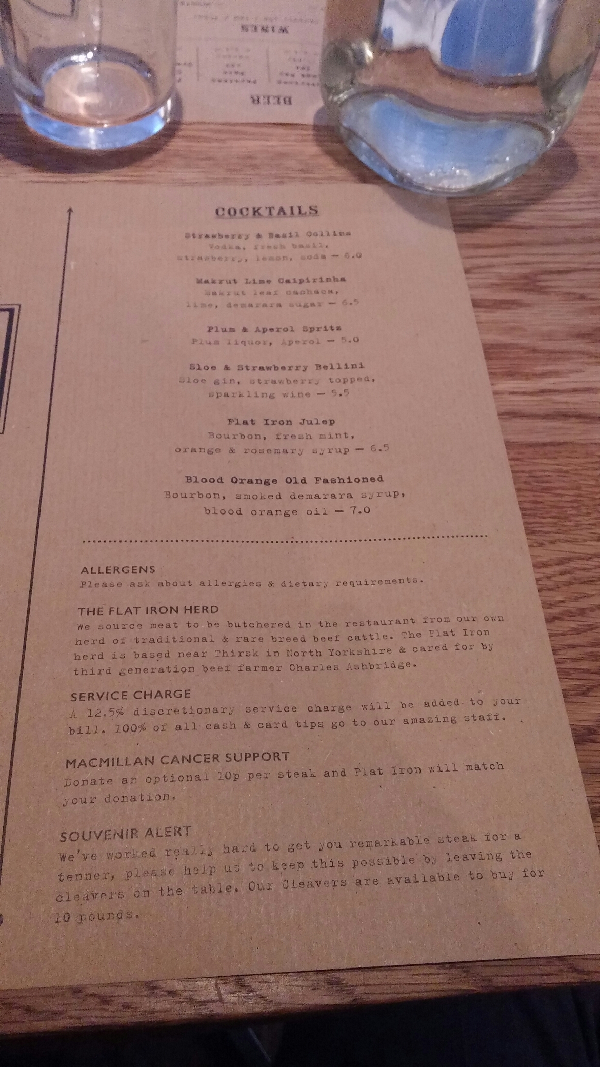 Add to this a service charge (added automatically which I don’t like, but it goes 100% to the staff which I do like – service was excellent) and a voluntary 10p charity donation to Macmillian Cancer Support (matched by Flat Iron) and my bill (with the added virtuousness of the donation) for a table service, sit down, steak and chips lunch came to £16.81. Can’t really fault that can you.
