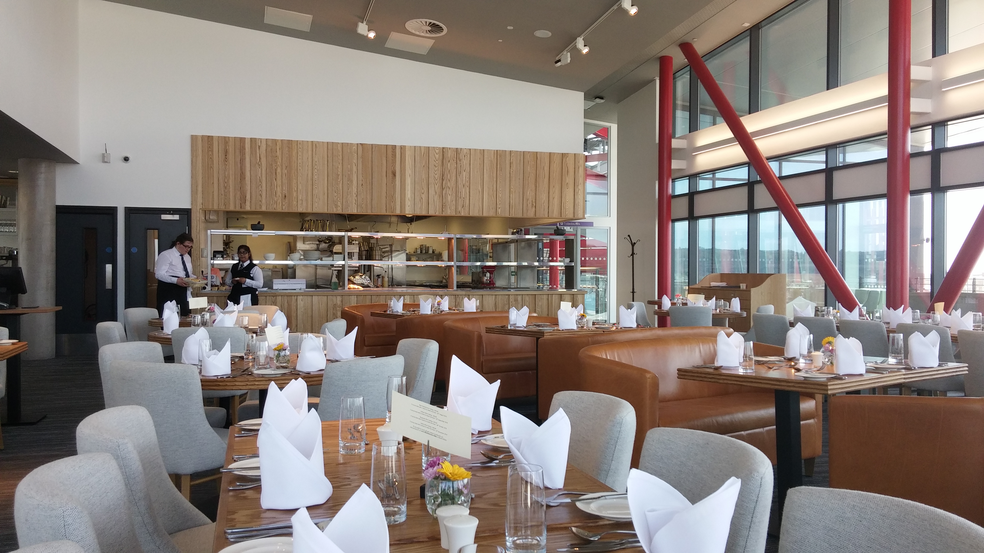 One college that has taken up this “on the job” training ethos with gusto is Cardiff and Vale College, with “the Classroom” restaurant at their spanking new Dumballs Road campus in Cardiff. As it is not too far from my office, J and I decided to give it a go. With it getting rave reviews and prices appearing very reasonable (especially for lunch) it all pointed to, as Jamie would say, “(H)appy Days”