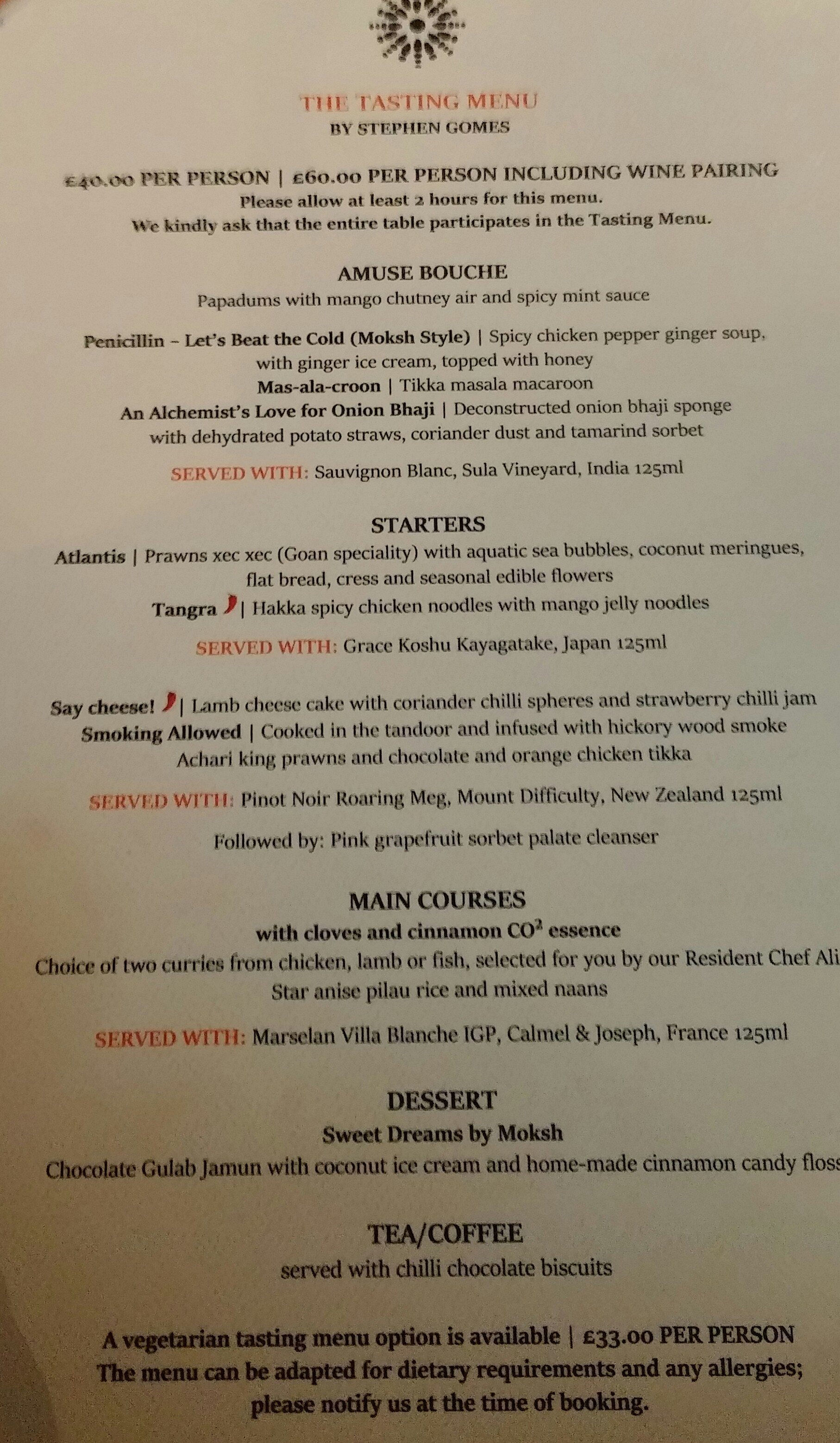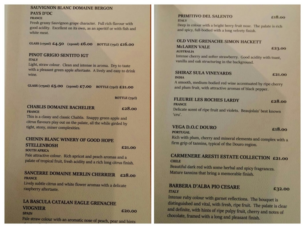Wine pairing – The marselan wine here (marselan being a hybrid grape of cabernet sauvignon and grenache) jarred somewhat with the spices in the two curries. It had lots of hard tannins and these clashed with the spicy curries.This as a pairing didn’t work for me or Mrs. SF (we left most of this wine) and my advice would be replace it with an off dry German riesling or if it has to be a red something without lots of tannin (maybe a barbera d’asti or d’alba or a not too oaky shiraz or a Chilean carmenere – most of which are actually on their wine list)
