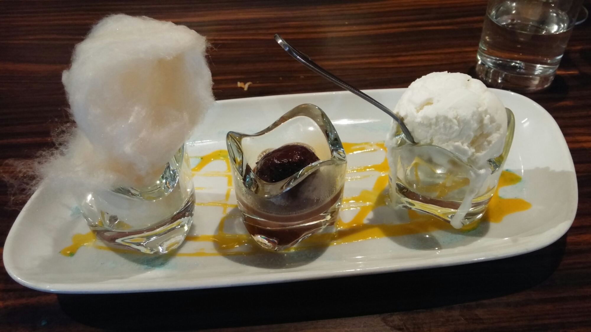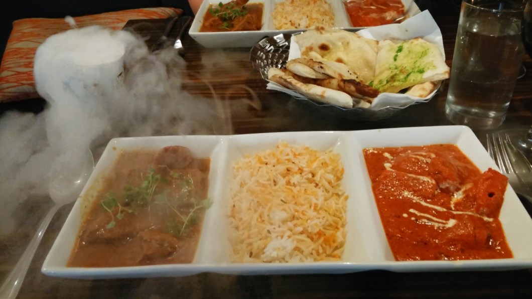 The desert (a nice cinnamon candyfloss, very good coconut ice cream and a – tad on the stodgy side – chocolate syrup sponge ball called a gulab juman)