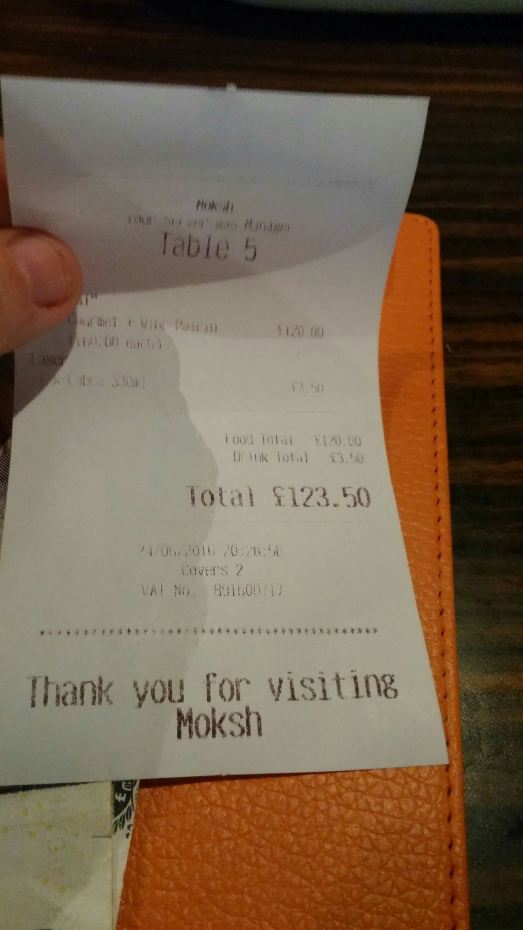 The bill (less tip and including a beer) was £123.50