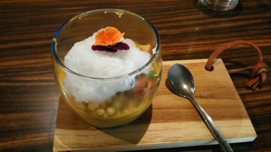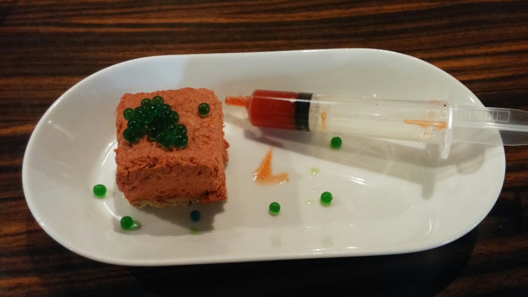 “Say cheese” was a coarse lamb and cheese pâté on a base, with a good flavour to it. It was nicely complimented by coriander chilli spheres, but I was not convinced by the strawberry chilli jam especially with it coming in a cheap plastic syringe. Mr. SF and I thought it looked a bit naff.