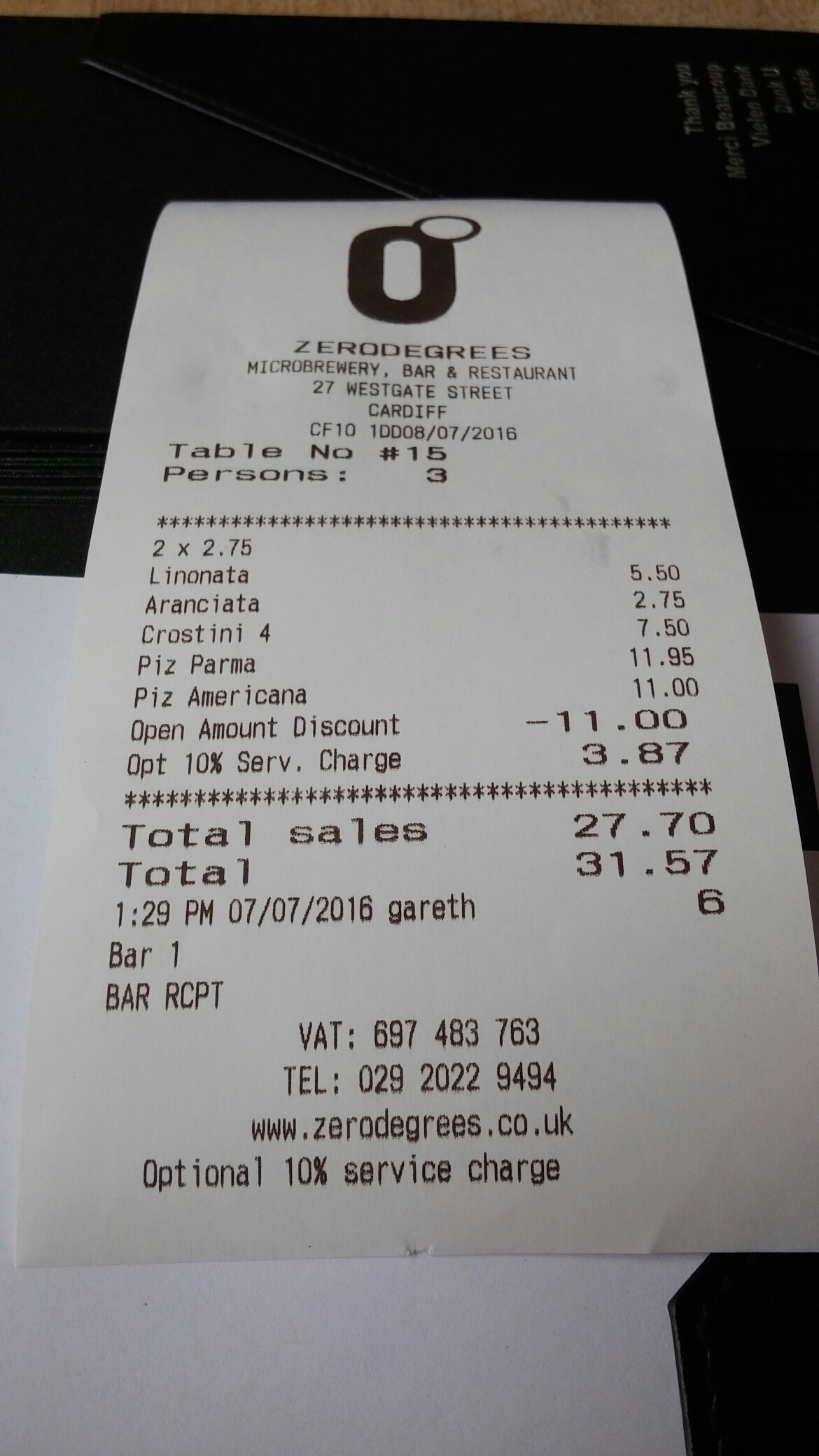 In terms of the bill it came to a not cheap, cheap (bearing in mind, due to the BOGOF, one of our two pizzas was free) £31.57 for three. This was due to the pricey soft drinks, the crostini and the very cheeky additional of an optional” service charge of 10% of the full, undiscounted, price rather than the actual bill amount (making it closer to 15%) of the actual cost