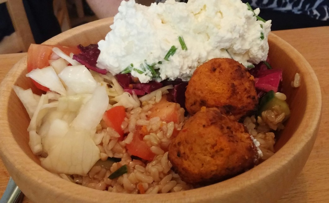 All the salads were lovely and fresh and their trademark wooden bowls hold a deceptively large amount – meaning there was a very decent sized portion for the price of about £5.30 (I think – base price + the add ons). Very nice was J’s view and from the taste I had it was difficult to argue with that conclusion