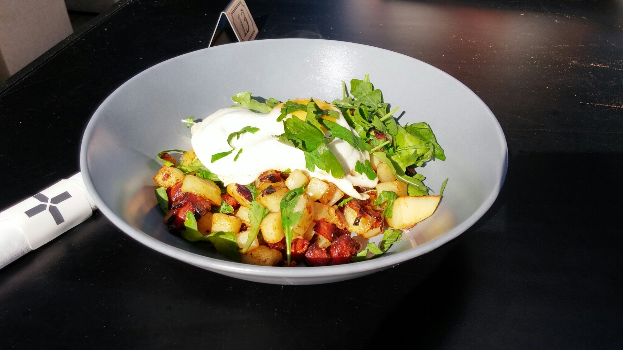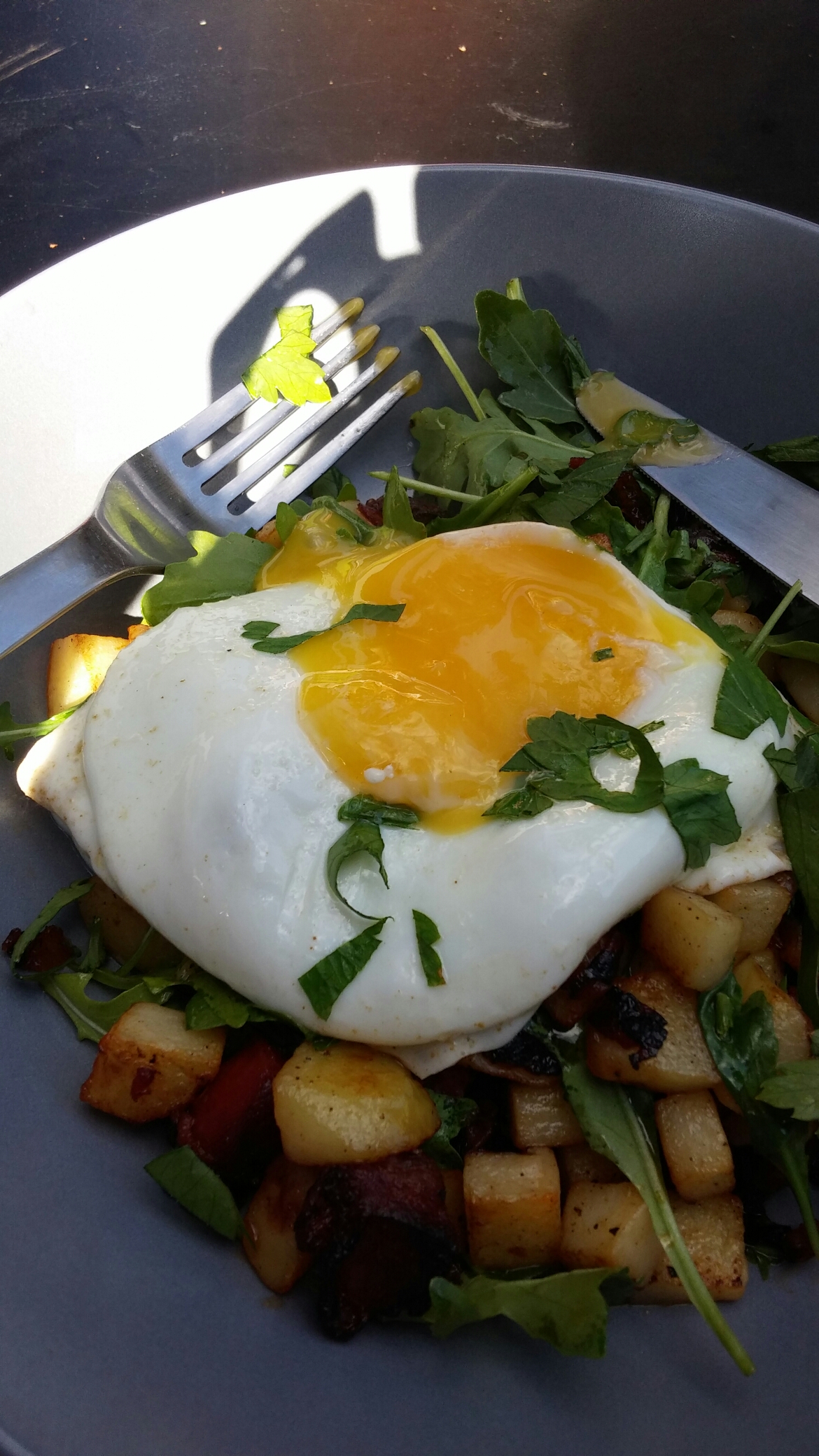 It was topped off by a nicely runny egg (a pre-requisite of a good hash is a proper runny egg which oozes into the hash mixture below) and some nice fresh herbs