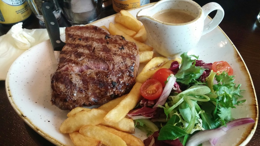 I have to admit I went more in hope than expectation and feared (bearing in mind the price) I would get a dinky, tasteless, overcooked steak. As it happened it wasn’t half bad and certainly good value for the reduced Monday offer price tag. I got over a quid in change from a tenner for a reasonable plate of steak and chips and a drink.