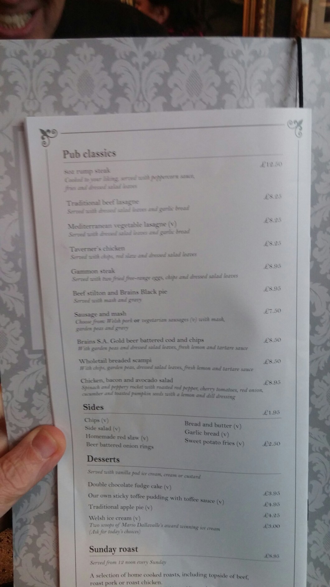 This contains the usual suspects, such as fish and chips, a pie, ham, egg and chips, scampi and chips etc. With prices ranging from £12.50 for steak and chips and £7.50 for sausage and mash (even without the discount) these look pretty reasonable.
