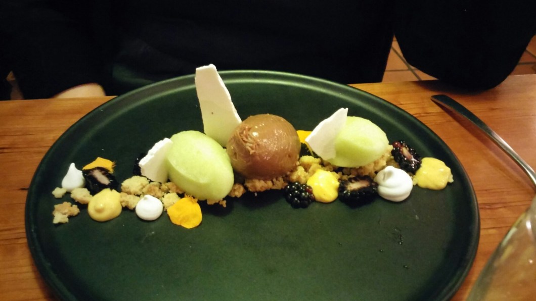 The blue cheese in the ice cream was quite subtle (thankfully) adding a nice tangy saltiness to the dish. It worked very well with the red wine poached pears (always a good combo blue cheese and pears) and the sweet nuttiness of the candied walnuts. Grapes added a touch of sharp to the equation. A classic accompaniment (cracker wise) for blue cheese is a digestive biscuit and the digestive crumb here worked very well as part of this dish. Really clever cooking here, with a lovely marriage of salt and sweet and just a drop of sharpness.