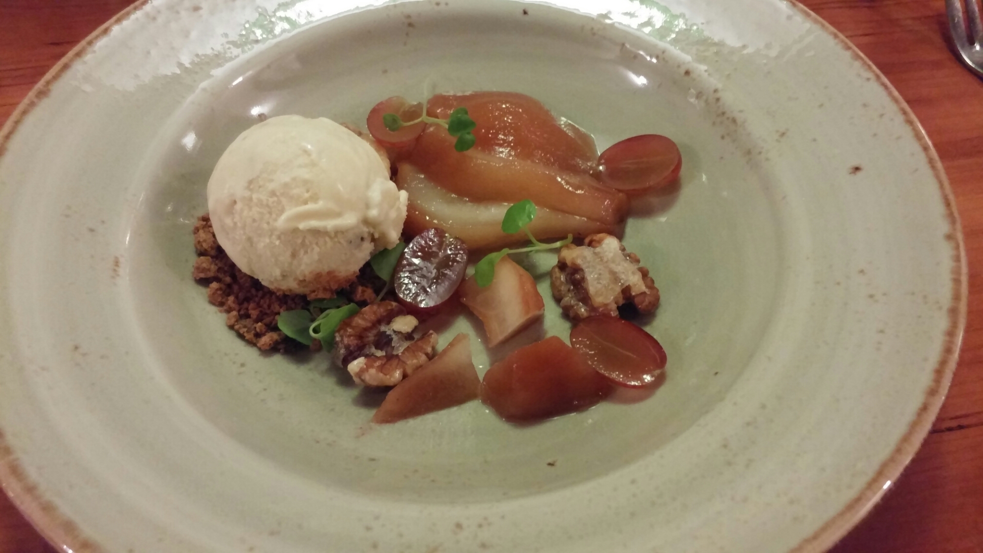 The blue cheese in the ice cream was quite subtle (thankfully) adding a nice tangy saltiness to the dish. It worked very well with the red wine poached pears (always a good combo blue cheese and pears) and the sweet nuttiness of the candied walnuts. Grapes added a touch of sharp to the equation. A classic accompaniment (cracker wise) for blue cheese is a digestive biscuit and the digestive crumb here worked very well as part of this dish. Really clever cooking here, with a lovely marriage of salt and sweet and just a drop of sharpness.