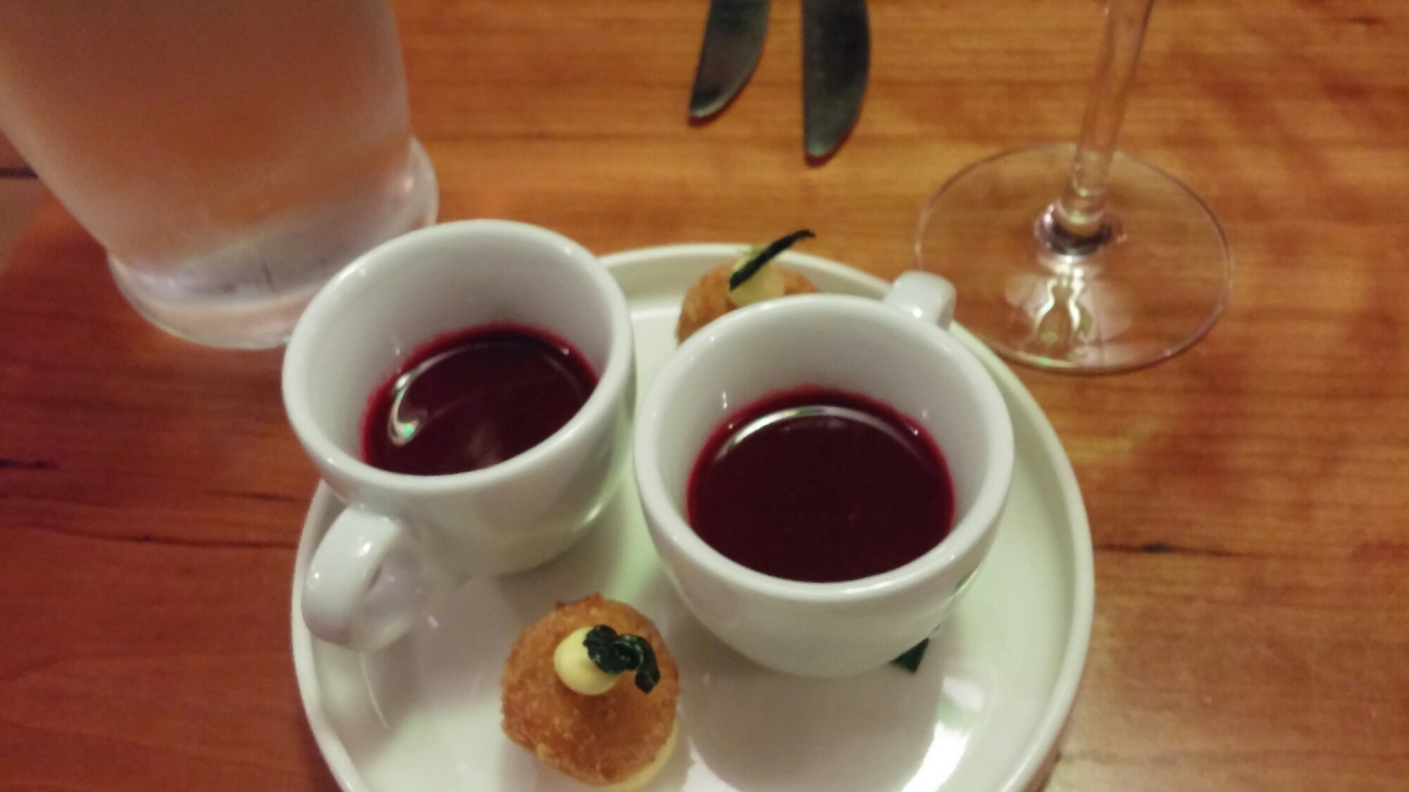 Once we had made our choices, a lovely amuse bouche arrived in the form of a soupçon of an earthy borscht type affair and a smoked haddock fish cake (topped with a lovely bit of crispy kale).